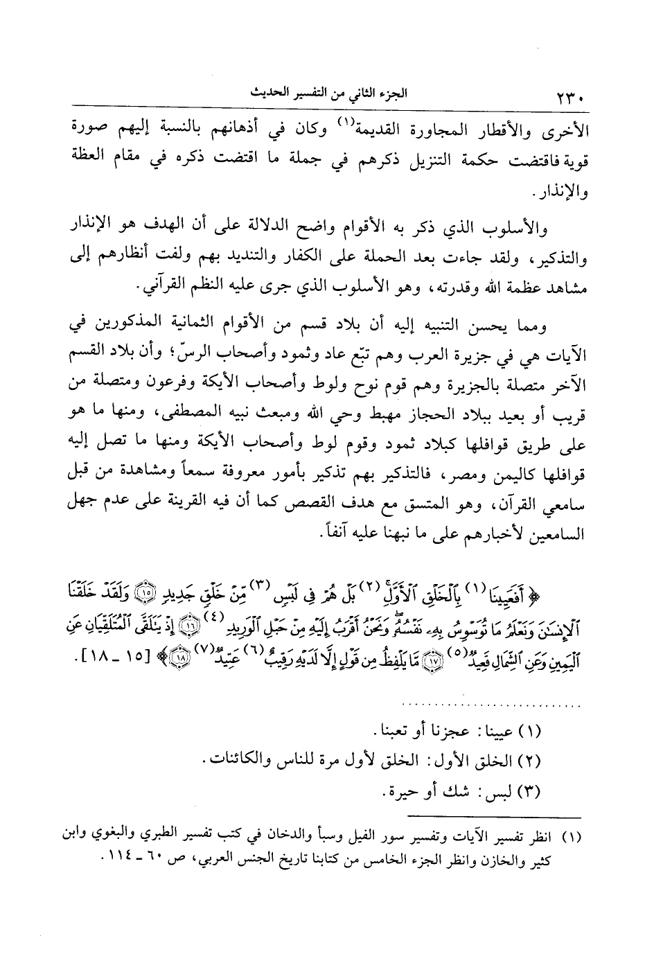 أَفَعَيِينا بِالْخَلْقِ الْأَوَّلِ بَلْ هُمْ فِي لَبْسٍ مِنْ خَلْقٍ جَدِيدٍ (15) وَلَقَدْ خَلَقْنَا الْإِنْسانَ وَنَعْلَمُ ما تُوَسْوِسُ بِهِ نَفْسُهُ وَنَحْنُ أَقْرَبُ إِلَيْهِ مِنْ حَبْلِ الْوَرِيدِ (16) إِذْ يَتَلَقَّى الْمُتَلَقِّيانِ عَنِ الْيَمِينِ وَعَنِ الشِّمالِ قَعِيدٌ (17) ما يَلْفِظُ مِنْ قَوْلٍ إِلاَّ لَدَيْهِ رَقِيبٌ عَتِيدٌ (18)