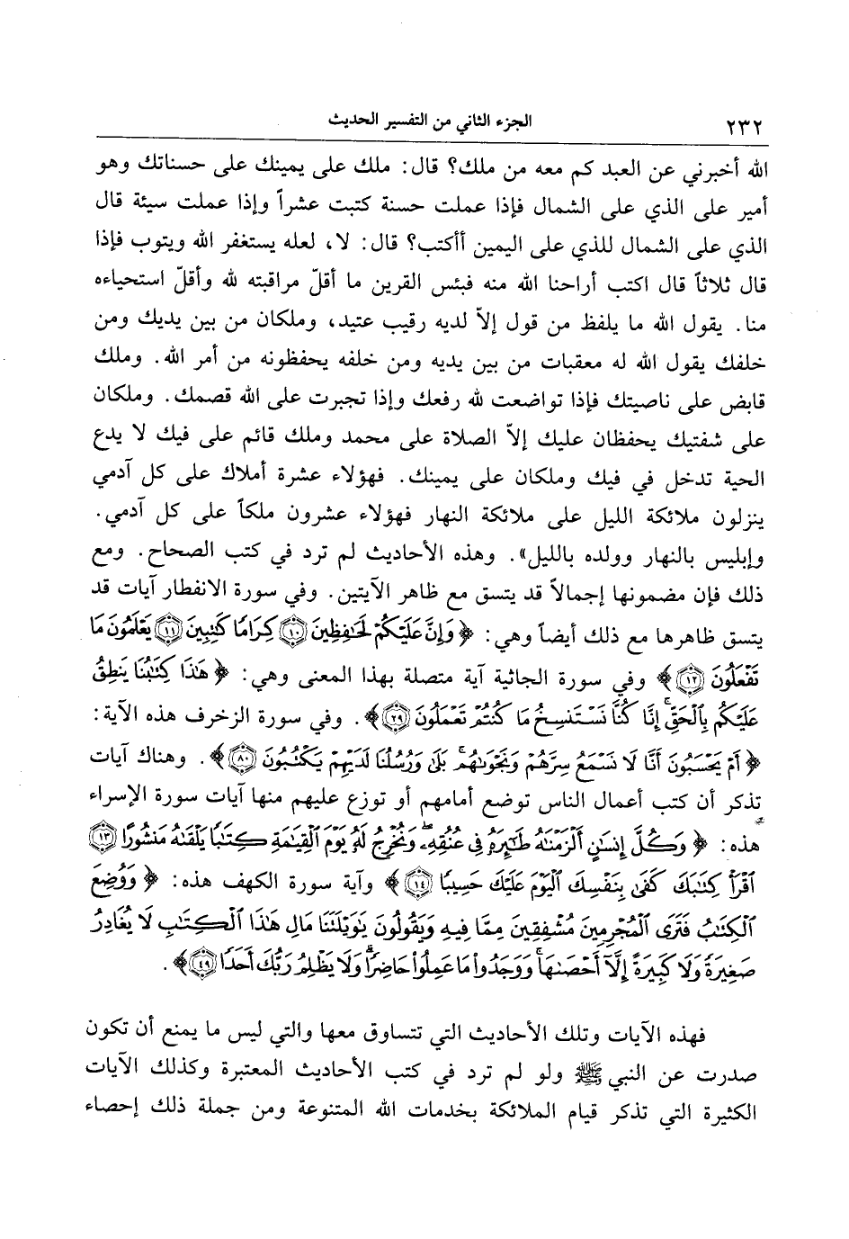 وإبليس بالنهار وولده بالليل» . وهذه الأحاديث لم ترد في كتب الصحاح. ومع ذلك فإن مضمونها إجمالا قد يتسق مع ظاهر الآيتين. وفي سورة الانفطار آيات قد يتسق ظاهرها مع ذلك أيضا وهي: وَإِنَّ عَلَيْكُمْ لَحافِظِينَ (10) كِراماً كاتِبِينَ (11) يَعْلَمُونَ ما تَفْعَلُونَ (12) وفي سورة الجاثية آية متصلة بهذا المعنى وهي: هذا كِتابُنا يَنْطِقُ عَلَيْكُمْ بِالْحَقِّ إِنَّا كُنَّا نَسْتَنْسِخُ ما كُنْتُمْ تَعْمَلُونَ (29) . وفي سورة الزخرف هذه الآية: