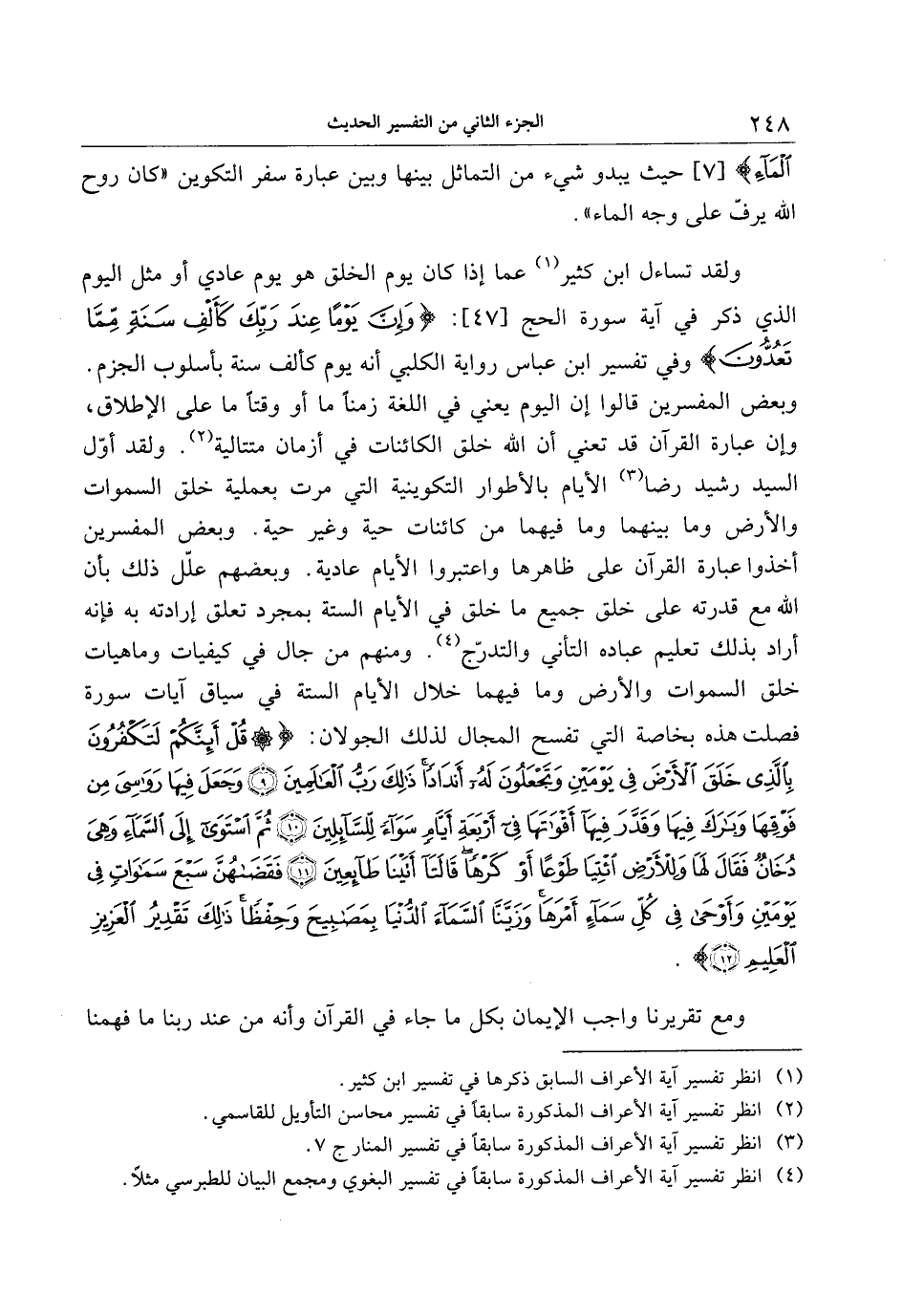 وبعض المفسرين قالوا إن اليوم يعني في اللغة زمنا ما أو وقتا ما على الإطلاق، وإن عبارة القرآن قد تعني أن الله خلق الكائنات في أزمان متتالية «2» . ولقد أوّل السيد رشيد رضا «3» الأيام بالأطوار التكوينية التي مرت بعملية خلق السموات والأرض وما بينهما وما فيهما من كائنات حية وغير حية. وبعض المفسرين أخذوا عبارة القرآن على ظاهرها واعتبروا الأيام عادية. وبعضهم علّل ذلك بأن الله مع قدرته على خلق جميع ما خلق في الأيام الستة بمجرد تعلق إرادته به فإنه أراد بذلك تعليم عباده التأني والتدرّج «4» . ومنهم من جال في كيفيات وماهيات خلق السموات والأرض وما فيهما خلال الأيام الستة في سياق آيات سورة فصلت هذه بخاصة التي تفسح المجال لذلك الجولان: قُلْ أَإِنَّكُمْ لَتَكْفُرُونَ بِالَّذِي خَلَقَ الْأَرْضَ فِي يَوْمَيْنِ وَتَجْعَلُونَ لَهُ أَنْداداً ذلِكَ رَبُّ الْعالَمِينَ (9) وَجَعَلَ فِيها رَواسِيَ مِنْ فَوْقِها وَبارَكَ فِيها وَقَدَّرَ فِيها أَقْواتَها فِي أَرْبَعَةِ أَيَّامٍ سَواءً لِلسَّائِلِينَ (10) ثُمَّ اسْتَوى إِلَى السَّماءِ وَهِيَ دُخانٌ فَقالَ لَها وَلِلْأَرْضِ ائْتِيا طَوْعاً أَوْ كَرْهاً قالَتا أَتَيْنا طائِعِينَ (11) فَقَضاهُنَّ سَبْعَ سَماواتٍ فِي يَوْمَيْنِ وَأَوْحى فِي كُلِّ سَماءٍ أَمْرَها وَزَيَّنَّا السَّماءَ الدُّنْيا بِمَصابِيحَ وَحِفْظاً ذلِكَ تَقْدِيرُ الْعَزِيزِ الْعَلِيمِ (12) .