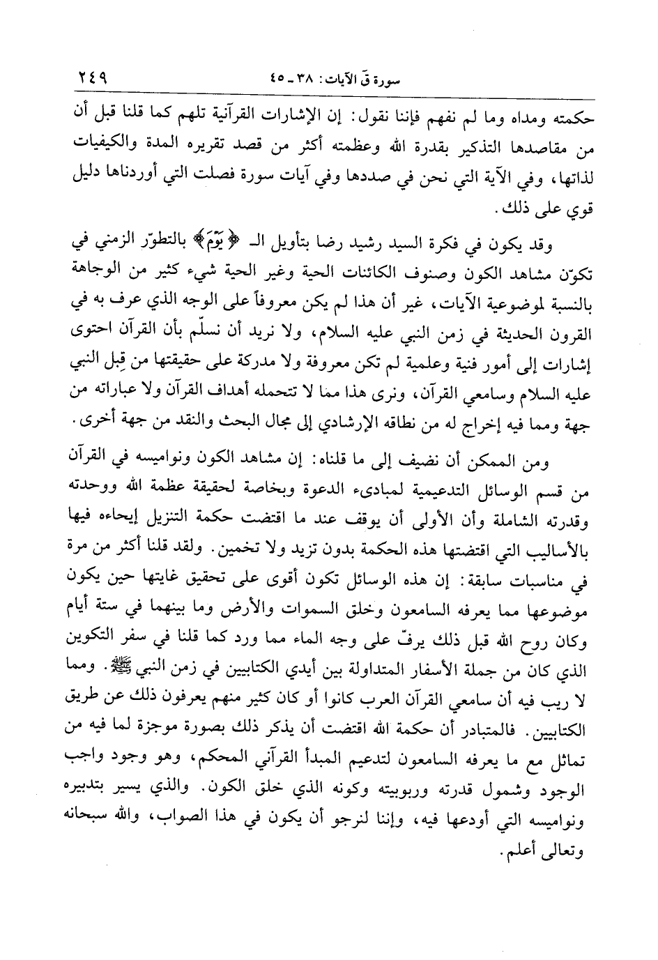 وقد يكون في فكرة السيد رشيد رضا بتأويل اليوم بالتطوّر الزمني في تكوّن مشاهد الكون وصنوف الكائنات الحية وغير الحية شيء كثير من الوجاهة بالنسبة لموضوعية الآيات، غير أن هذا لم يكن معروفا على الوجه الذي عرف به في القرون الحديثة في زمن النبي عليه السلام، ولا نريد أن نسلّم بأن القرآن احتوى إشارات إلى أمور فنية وعلمية لم تكن معروفة ولا مدركة على حقيقتها من قبل النبي عليه السلام وسامعي القرآن، ونرى هذا مما لا تتحمله أهداف القرآن ولا عباراته من جهة ومما فيه إخراج له من نطاقه الإرشادي إلى مجال البحث والنقد من جهة أخرى.