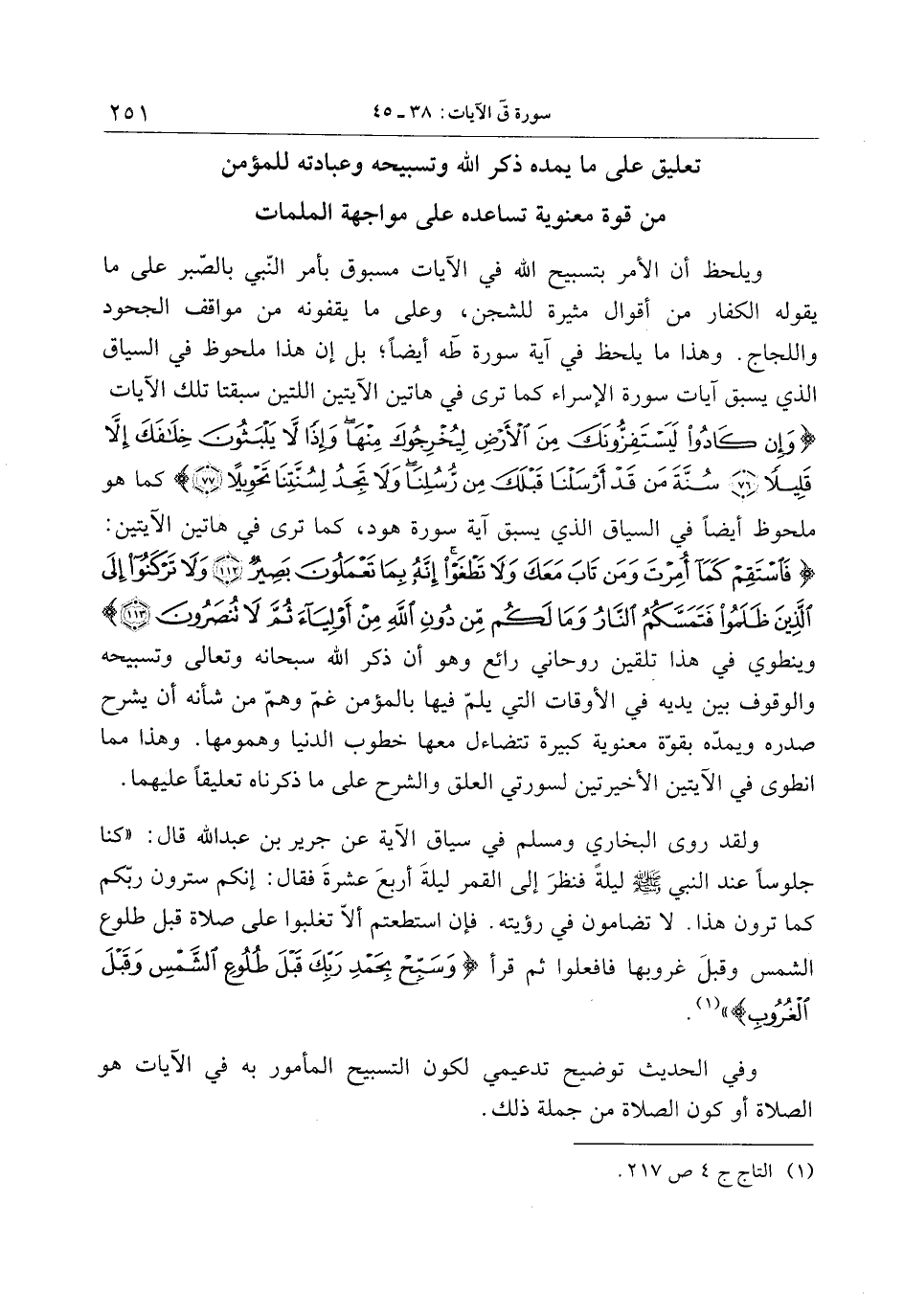 ولقد روى البخاري ومسلم في سياق الآية عن جرير بن عبد الله قال: «كنا جلوسا عند النبي صلّى الله عليه وسلّم ليلة فنظر إلى القمر ليلة أربع عشرة فقال: إنكم سترون ربّكم كما ترون هذا. لا تضامون في رؤيته. فإن استطعتم ألّا تغلبوا على صلاة قبل طلوع الشمس وقبل غروبها فافعلوا ثم قرأ وَسَبِّحْ بِحَمْدِ رَبِّكَ قَبْلَ طُلُوعِ الشَّمْسِ وَقَبْلَ الْغُرُوبِ «1» .
