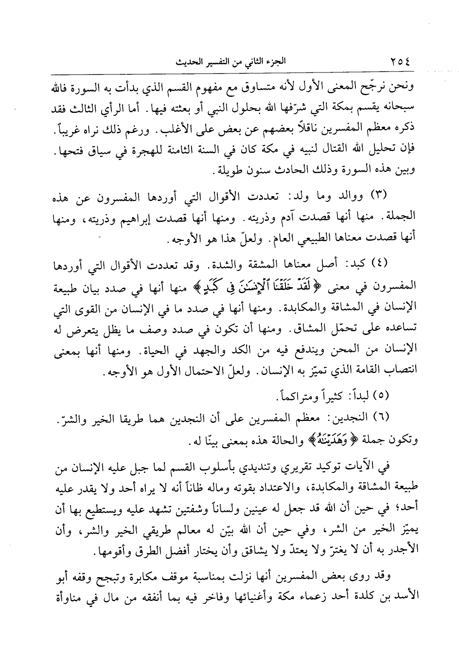 (4) كبد: أصل معناها المشقة والشدة. وقد تعددت الأقوال التي أوردها المفسرون في معنى لَقَدْ خَلَقْنَا الْإِنْسانَ فِي كَبَدٍ منها أنها في صدد بيان طبيعة الإنسان في المشاقة والمكابدة. ومنها أنها في صدد ما في الإنسان من القوى التي تساعده على تحمّل المشاق. ومنها أن تكون في صدد وصف ما يظل يتعرض له الإنسان من المحن ويندفع فيه من الكد والجهد في الحياة. ومنها أنها بمعنى انتصاب القامة الذي تميّز به الإنسان. ولعلّ الاحتمال الأول هو الأوجه.