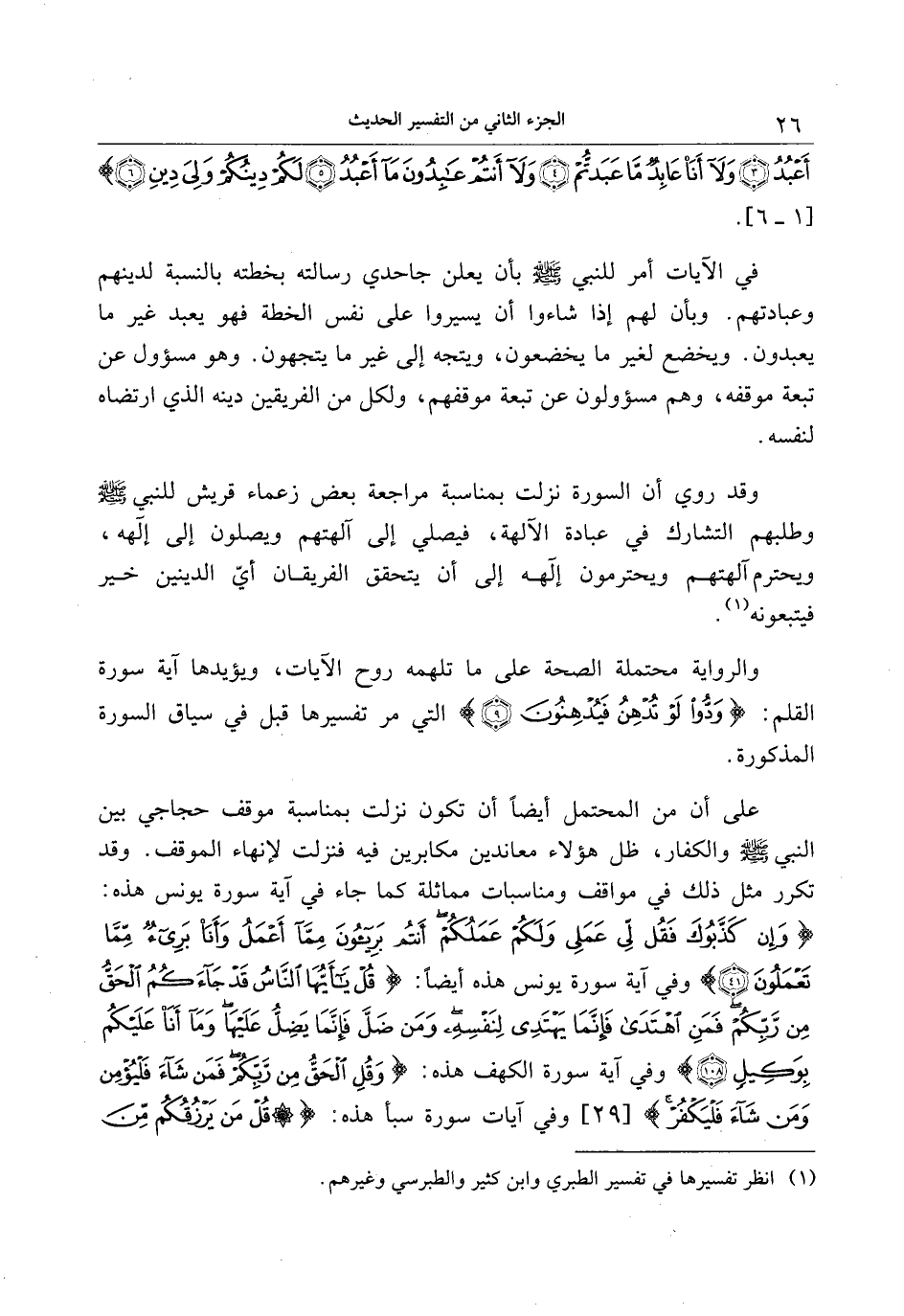في الآيات أمر للنبي صلّى الله عليه وسلّم بأن يعلن جاحدي رسالته بخطته بالنسبة لدينهم وعبادتهم. وبأن لهم إذا شاءوا أن يسيروا على نفس الخطة فهو يعبد غير ما يعبدون. ويخضع لغير ما يخضعون، ويتجه إلى غير ما يتجهون. وهو مسؤول عن تبعة موقفه، وهم مسؤولون عن تبعة موقفهم، ولكل من الفريقين دينه الذي ارتضاه لنفسه.