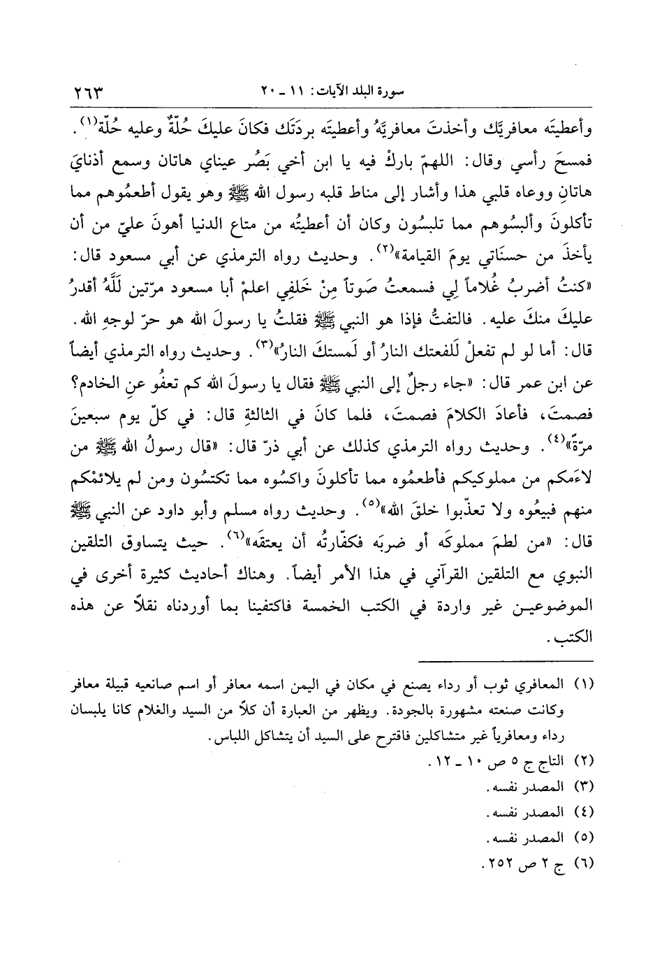 فصمت، فأعاد الكلام فصمت، فلما كان في الثالثة قال: في كلّ يوم سبعين مرّة» «4» . وحديث رواه الترمذي كذلك عن أبي ذرّ قال: «قال رسول الله صلّى الله عليه وسلّم من لاءمكم من مملوكيكم فأطعموه مما تأكلون واكسوه مما تكتسون ومن لم يلائمكم منهم فبيعوه ولا تعذّبوا خلق الله» «5» . وحديث رواه مسلم وأبو داود عن النبي صلّى الله عليه وسلّم قال: «من لطم مملوكه أو ضربه فكفّارته أن يعتقه» «6» . حيث يتساوق التلقين النبوي مع التلقين القرآني في هذا الأمر أيضا. وهناك أحاديث كثيرة أخرى في الموضوعين غير واردة في الكتب الخمسة فاكتفينا بما أوردناه نقلا عن هذه الكتب.