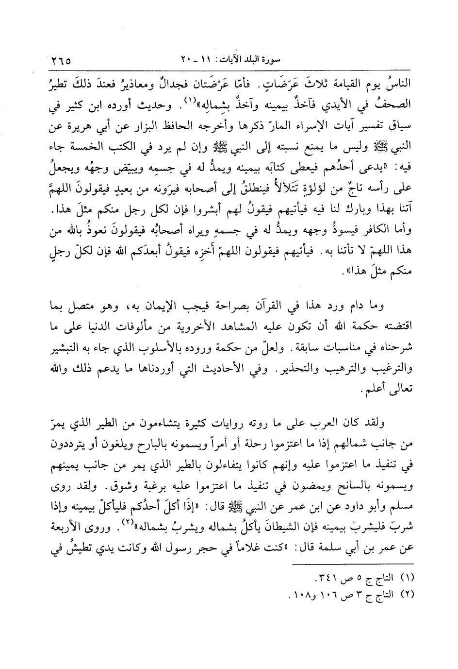 وما دام ورد هذا في القرآن بصراحة فيجب الإيمان به، وهو متصل بما اقتضته حكمة الله أن تكون عليه المشاهد الأخروية من مألوفات الدنيا على ما شرحناه في مناسبات سابقة. ولعلّ من حكمة وروده بالأسلوب الذي جاء به التبشير والترغيب والترهيب والتحذير. وفي الأحاديث التي أوردناها ما يدعم ذلك والله تعالى أعلم.