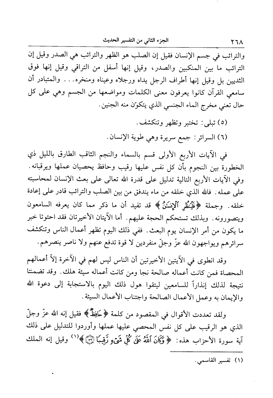 وفي الآيات الأربع التالية تدليل على قدرة الله تعالى على بعث الإنسان لمحاسبته على عمله. فالله الذي خلقه من ماء يندفق من بين الصلب والترائب قادر على إعادة خلقه. وجملة فَلْيَنْظُرِ الْإِنْسانُ قد تفيد أن ما ذكر مما كان يعرفه السامعون ويتصورونه. وبذلك تستحكم الحجة عليهم. أما الآيتان الأخيرتان فقد احتوتا خبر ما يكون من أمر الإنسان يوم البعث. ففي ذلك اليوم تظهر أعمال الناس وتنكشف سرائرهم ويواجهون الله عزّ وجلّ منفردين لا قوة تدفع عنهم ولا ناصر ينصرهم.