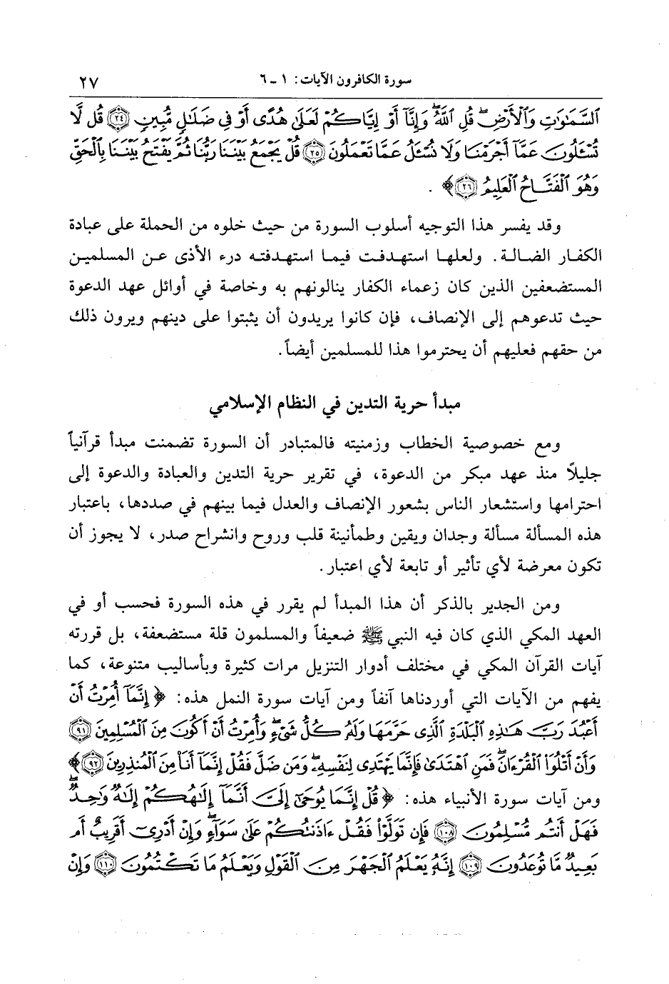 ومن الجدير بالذكر أن هذا المبدأ لم يقرر في هذه السورة فحسب أو في العهد المكي الذي كان فيه النبي صلّى الله عليه وسلّم ضعيفا والمسلمون قلة مستضعفة، بل قررته آيات القرآن المكي في مختلف أدوار التنزيل مرات كثيرة وبأساليب متنوعة، كما يفهم من الآيات التي أوردناها آنفا ومن آيات سورة النمل هذه: إِنَّما أُمِرْتُ أَنْ أَعْبُدَ رَبَّ هذِهِ الْبَلْدَةِ الَّذِي حَرَّمَها وَلَهُ كُلُّ شَيْءٍ وَأُمِرْتُ أَنْ أَكُونَ مِنَ الْمُسْلِمِينَ (91) وَأَنْ أَتْلُوَا الْقُرْآنَ فَمَنِ اهْتَدى فَإِنَّما يَهْتَدِي لِنَفْسِهِ وَمَنْ ضَلَّ فَقُلْ إِنَّما أَنَا مِنَ الْمُنْذِرِينَ (92) ومن آيات سورة الأنبياء هذه: قُلْ إِنَّما يُوحى إِلَيَّ أَنَّما إِلهُكُمْ إِلهٌ واحِدٌ فَهَلْ أَنْتُمْ مُسْلِمُونَ (108) فَإِنْ تَوَلَّوْا فَقُلْ آذَنْتُكُمْ عَلى سَواءٍ وَإِنْ أَدْرِي أَقَرِيبٌ أَمْ بَعِيدٌ ما تُوعَدُونَ (109) إِنَّهُ يَعْلَمُ الْجَهْرَ مِنَ الْقَوْلِ وَيَعْلَمُ ما تَكْتُمُونَ (110) وَإِنْ