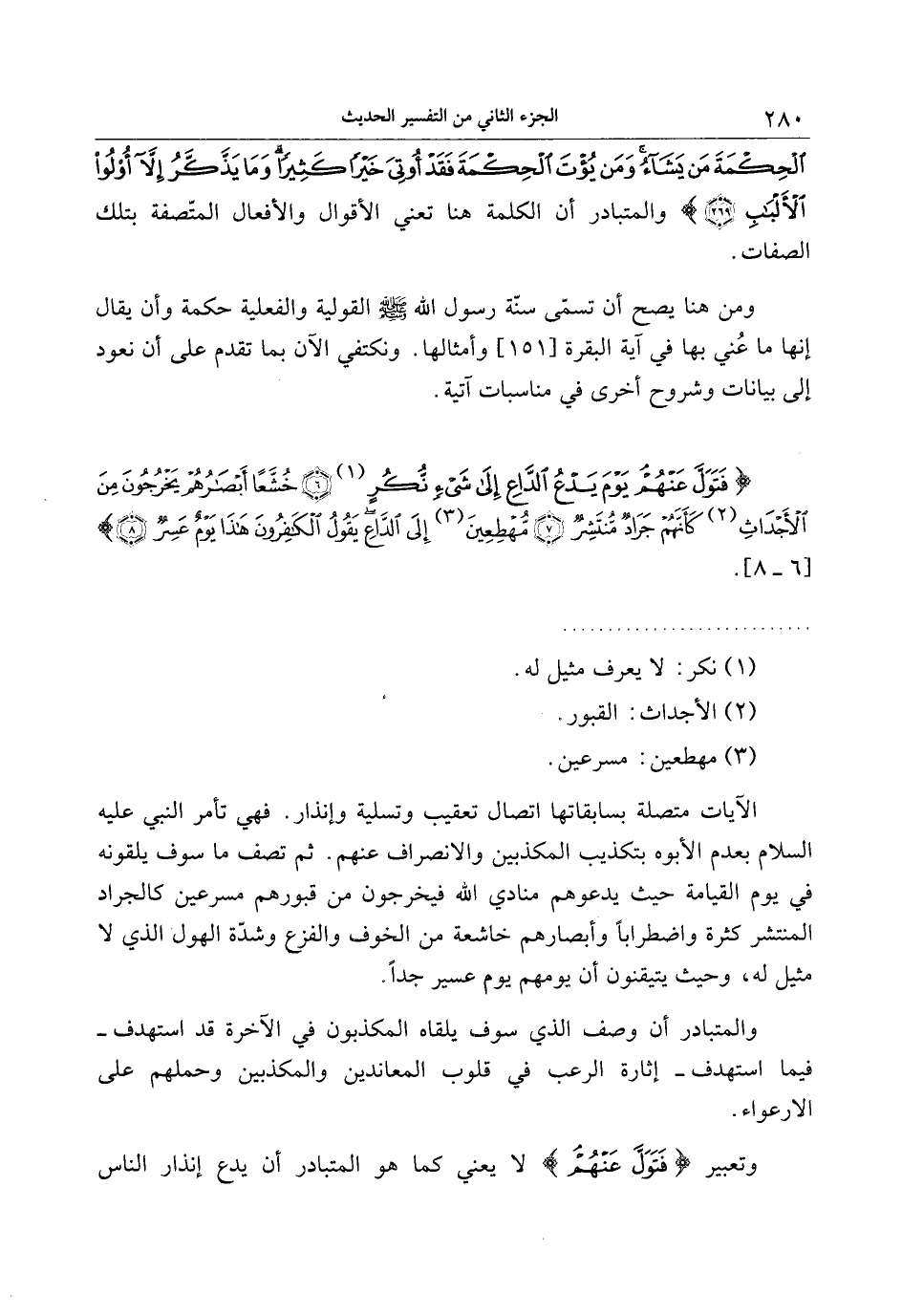 ومن هنا يصح أن تسمّى سنّة رسول الله صلّى الله عليه وسلّم القولية والفعلية حكمة وأن يقال إنها ما عني بها في آية البقرة [151] وأمثالها. ونكتفي الآن بما تقدم على أن نعود إلى بيانات وشروح أخرى في مناسبات آتية.