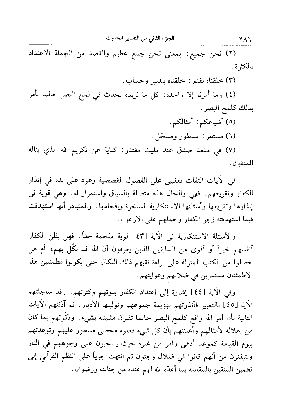 وفي الآية [44] إشارة إلى اعتداد الكفار بقوتهم وكثرتهم. وقد ساجلتهم الآية [45] بالتعبير فأنذرتهم بهزيمة جموعهم وتوليتها الأدبار. ثم آذنتهم الآيات التالية بأن أمر الله واقع كلمح البصر حالما تقترن مشيئته بشيء. وذكّرتهم بما كان من إهلاله لأمثالهم وأعلنتهم بأن كل شيء فعلوه محصى مسطور عليهم وتوعدتهم بيوم القيامة كموعد أدهى وأمرّ من غيره حيث يسحبون على وجوههم في النار ويتيقنون من أنهم كانوا في ضلال وجنون ثم انتهت جريا على النظم القرآني إلى تطمين المتقين بالمقابلة بما أعدّه الله لهم عنده من جنات ورضوان.