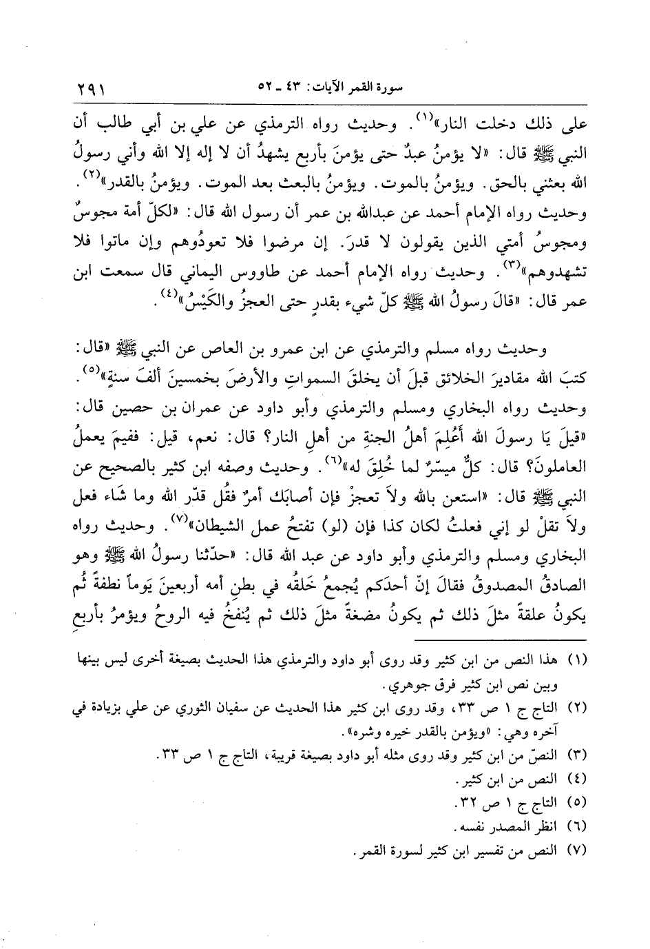 (2) التاج ج 1 ص 33، وقد روى ابن كثير هذا الحديث عن سفيان الثوري عن علي بزيادة في آخره وهي: «يؤمن بالقدر خيره وشره» .