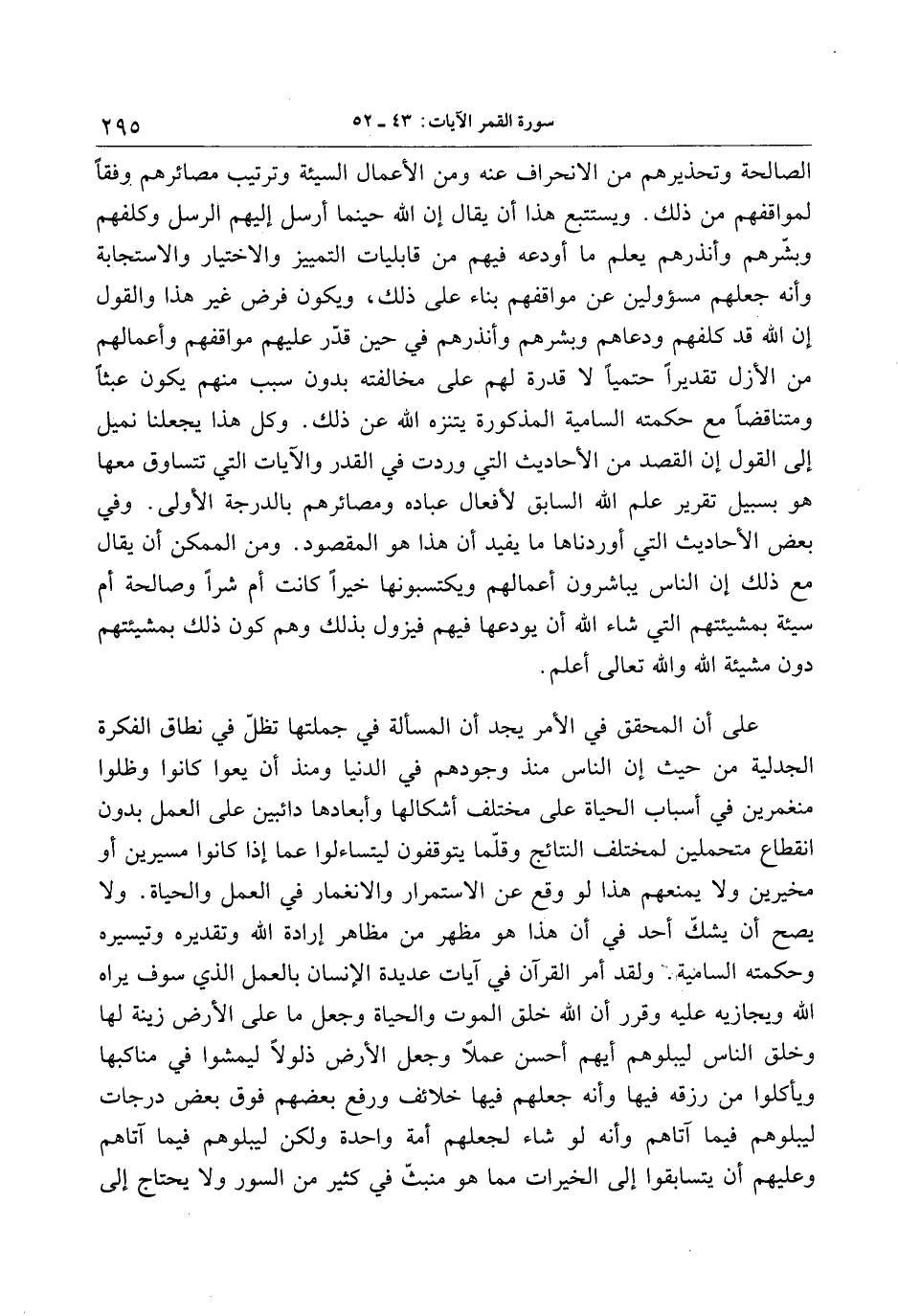 الصالحة وتحذيرهم من الانحراف عنه ومن الأعمال السيئة وترتيب مصائرهم وفقا لمواقفهم من ذلك. ويستتبع هذا أن يقال إن الله حينما أرسل إليهم الرسل وكلفهم وبشّرهم وأنذرهم يعلم ما أودعه فيهم من قابليات التمييز والاختيار والاستجابة وأنه جعلهم مسؤولين عن مواقفهم بناء على ذلك، ويكون فرض غير هذا والقول إن الله قد كلفهم ودعاهم وبشرهم وأنذرهم في حين قدّر عليهم مواقفهم وأعمالهم من الأزل تقديرا حتميا لا قدرة لهم على مخالفته بدون سبب منهم يكون عبثا ومتناقضا مع حكمته السامية المذكورة يتنزه الله عن ذلك. وكل هذا يجعلنا نميل إلى القول إن القصد من الأحاديث التي وردت في القدر والآيات التي تتساوق معها هو بسبيل تقرير علم الله السابق لأفعال عباده ومصائرهم بالدرجة الأولى. وفي بعض الأحاديث التي أوردناها ما يفيد أن هذا هو المقصود. ومن الممكن أن يقال مع ذلك إن الناس يباشرون أعمالهم ويكتسبونها خيرا كانت أم شرا وصالحة أم سيئة بمشيئتهم التي شاء الله أن يودعها فيهم فيزول بذلك وهم كون ذلك بمشيئتهم دون مشيئة الله والله تعالى أعلم.