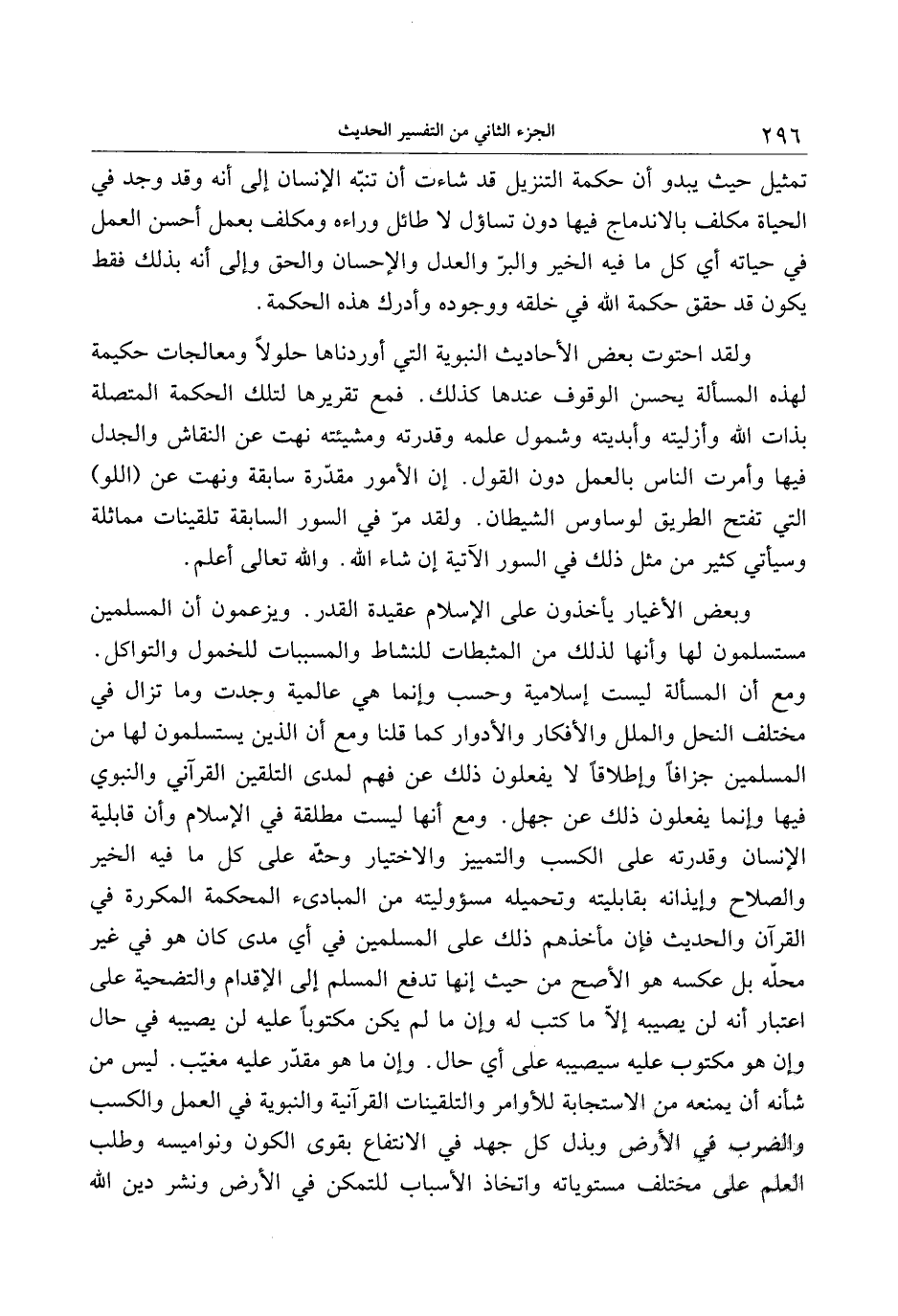 ولقد احتوت بعض الأحاديث النبوية التي أوردناها حلو لا ومعالجات حكيمة لهذه المسألة يحسن الوقوف عندها كذلك. فمع تقريرها لتلك الحكمة المتصلة بذات الله وأزليته وأبديته وشمول علمه وقدرته ومشيئته نهت عن النقاش والجدل فيها وأمرت الناس بالعمل دون القول. إن الأمور مقدّرة سابقة ونهت عن (اللو) التي تفتح الطريق لوساوس الشيطان. ولقد مرّ في السور السابقة تلقينات مماثلة وسيأتي كثير من مثل ذلك في السور الآتية إن شاء الله. والله تعالى أعلم.