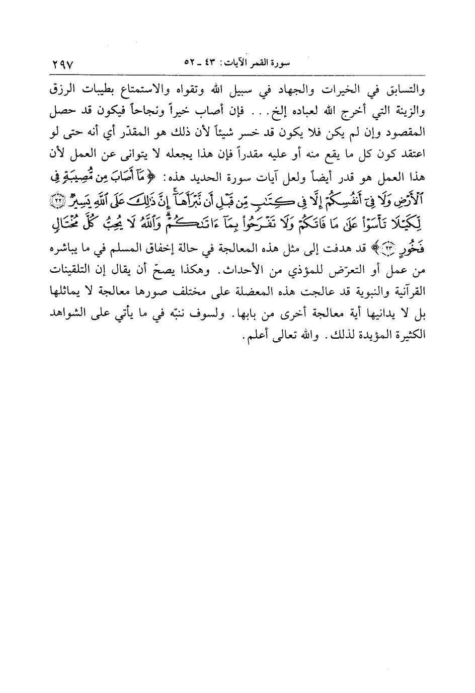 والتسابق في الخيرات والجهاد في سبيل الله وتقواه والاستمتاع بطيبات الرزق والزينة التي أخرج الله لعباده إلخ ... فإن أصاب خيرا ونجاحا فيكون قد حصل المقصود وإن لم يكن فلا يكون قد خسر شيئا لأن ذلك هو المقدّر أي أنه حتى لو اعتقد كون كل ما يقع منه أو عليه مقدرا فإن هذا يجعله لا يتوانى عن العمل لأن هذا العمل هو قدر أيضا ولعل آيات سورة الحديد هذه: ما أَصابَ مِنْ مُصِيبَةٍ فِي الْأَرْضِ وَلا فِي أَنْفُسِكُمْ إِلَّا فِي كِتابٍ مِنْ قَبْلِ أَنْ نَبْرَأَها إِنَّ ذلِكَ عَلَى اللَّهِ يَسِيرٌ (22) لِكَيْلا تَأْسَوْا عَلى ما فاتَكُمْ وَلا تَفْرَحُوا بِما آتاكُمْ وَاللَّهُ لا يُحِبُّ كُلَّ مُخْتالٍ فَخُورٍ (23) قد هدفت إلى مثل هذه المعالجة في حالة إخفاق المسلم في ما يباشره من عمل أو التعرّض للمؤذي من الأحداث. وهكذا يصحّ أن يقال إن التلقينات القرآنية والنبوية قد عالجت هذه المعضلة على مختلف صورها معالجة لا يماثلها بل لا يدانيها أية معالجة أخرى من بابها. ولسوف ننّبه في ما يأتي على الشواهد الكثيرة المؤيدة لذلك. والله تعالى أعلم.