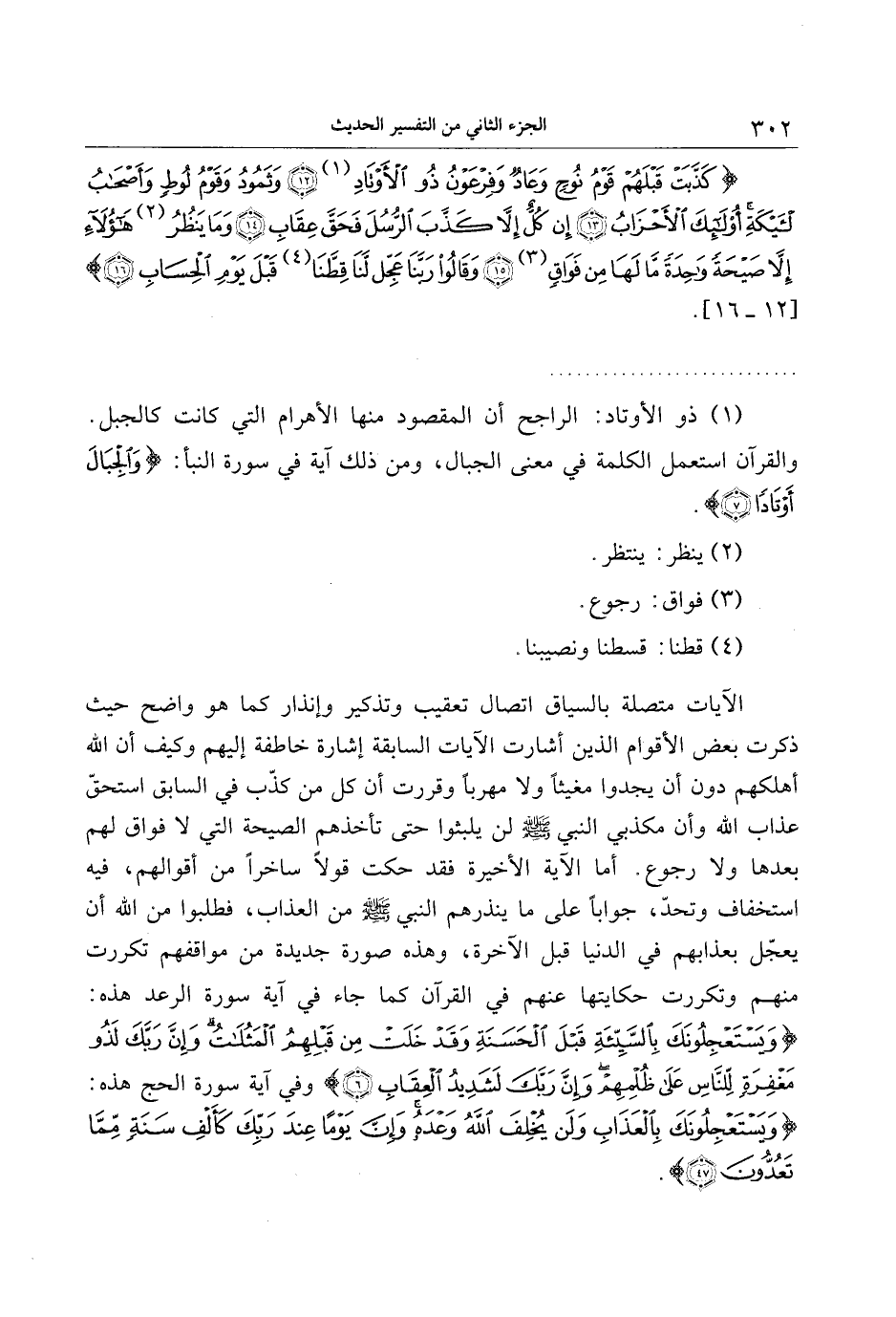 كَذَّبَتْ قَبْلَهُمْ قَوْمُ نُوحٍ وَعادٌ وَفِرْعَوْنُ ذُو الْأَوْتادِ (1) (12) وَثَمُودُ وَقَوْمُ لُوطٍ وَأَصْحابُ الْأَيْكَةِ أُولئِكَ الْأَحْزابُ (13) إِنْ كُلٌّ إِلَّا كَذَّبَ الرُّسُلَ فَحَقَّ عِقابِ (14) وَما يَنْظُرُ (2) هؤُلاءِ إِلَّا صَيْحَةً واحِدَةً ما لَها مِنْ فَواقٍ (3) (15) وَقالُوا رَبَّنا عَجِّلْ لَنا قِطَّنا (4) قَبْلَ يَوْمِ الْحِسابِ (16) [12- 16] .