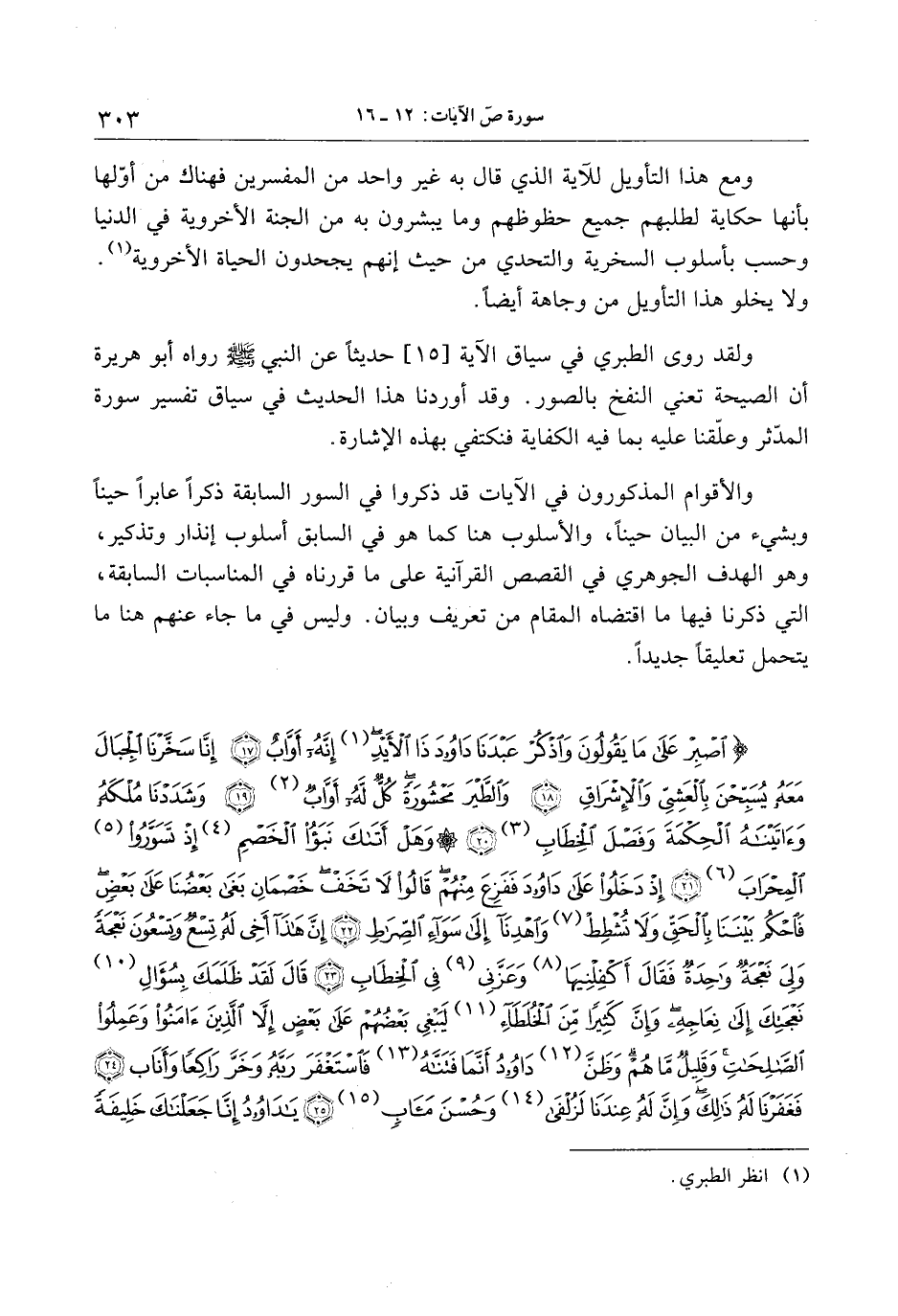 اصْبِرْ عَلى ما يَقُولُونَ وَاذْكُرْ عَبْدَنا داوُدَ ذَا الْأَيْدِ (1) إِنَّهُ أَوَّابٌ (17) إِنَّا سَخَّرْنَا الْجِبالَ مَعَهُ يُسَبِّحْنَ بِالْعَشِيِّ وَالْإِشْراقِ (18) وَالطَّيْرَ مَحْشُورَةً كُلٌّ لَهُ أَوَّابٌ (2) (19) وَشَدَدْنا مُلْكَهُ وَآتَيْناهُ الْحِكْمَةَ وَفَصْلَ الْخِطابِ (3) (20) وَهَلْ أَتاكَ نَبَأُ الْخَصْمِ (4) إِذْ تَسَوَّرُوا (5) الْمِحْرابَ (6) (21) إِذْ دَخَلُوا عَلى داوُدَ فَفَزِعَ مِنْهُمْ قالُوا لا تَخَفْ خَصْمانِ بَغى بَعْضُنا عَلى بَعْضٍ فَاحْكُمْ بَيْنَنا بِالْحَقِّ وَلا تُشْطِطْ (7) وَاهْدِنا إِلى سَواءِ الصِّراطِ (22) إِنَّ هذا أَخِي لَهُ تِسْعٌ وَتِسْعُونَ نَعْجَةً وَلِيَ نَعْجَةٌ واحِدَةٌ فَقالَ أَكْفِلْنِيها (8) وَعَزَّنِي (9) فِي الْخِطابِ (23) قالَ لَقَدْ ظَلَمَكَ بِسُؤالِ (10) نَعْجَتِكَ إِلى نِعاجِهِ وَإِنَّ كَثِيراً مِنَ الْخُلَطاءِ (11) لَيَبْغِي بَعْضُهُمْ عَلى بَعْضٍ إِلَّا الَّذِينَ آمَنُوا وَعَمِلُوا الصَّالِحاتِ وَقَلِيلٌ ما هُمْ وَظَنَّ (12) داوُدُ أَنَّما فَتَنَّاهُ (13) فَاسْتَغْفَرَ رَبَّهُ وَخَرَّ راكِعاً وَأَنابَ (24) فَغَفَرْنا لَهُ ذلِكَ وَإِنَّ لَهُ عِنْدَنا لَزُلْفى (14) وَحُسْنَ مَآبٍ (15) (25) يا داوُدُ إِنَّا جَعَلْناكَ خَلِيفَةً