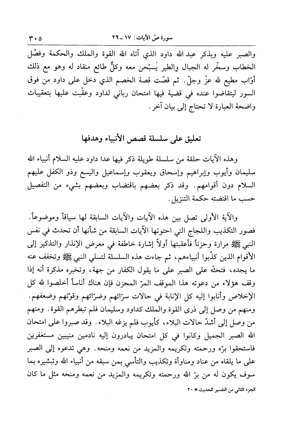 ومنهم من وصل إلى ذرى القوة والملك كداود وسليمان فلم تبطرهم القوة. ومنهم من وصل إلى أشدّ حالات البلاء، كأيوب فلم يزغه البلاء. وقد صبروا على امتحان الله الصبر الجميل وكانوا في كل امتحان يبادرون إليه نادمين منيبين مستغفرين فاستحقوا برّه ورحمته وتكريمه والمزيد من نعمه ومنحه. وهي تدعوه إلى الصبر على ما يلقاه من عناد ومناوأة وتكذيب والتأسي بمن سبقه من أنبياء الله وتبشيره بما سوف يكون له من برّ الله ورحمته وتكريمه والمزيد من نعمه ومنحه مثل ما كان الجز الثاني من التفسير الحديث 20