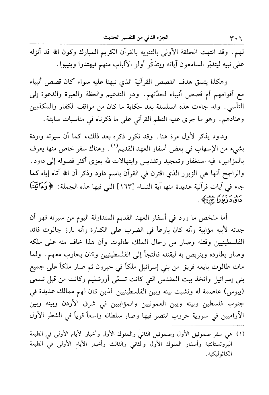 وداود يذكر لأول مرة هنا. وقد تكرر ذكره بعد ذلك، كما أن سيرته واردة بشيء من الإسهاب في بعض أسفار العهد القديم «1» . وهناك سفر خاص منها يعرف بالمزامير، فيه استغفار وتمجيد وتقديس وابتهالات لله يعزى أكثر فصوله إلى داود.