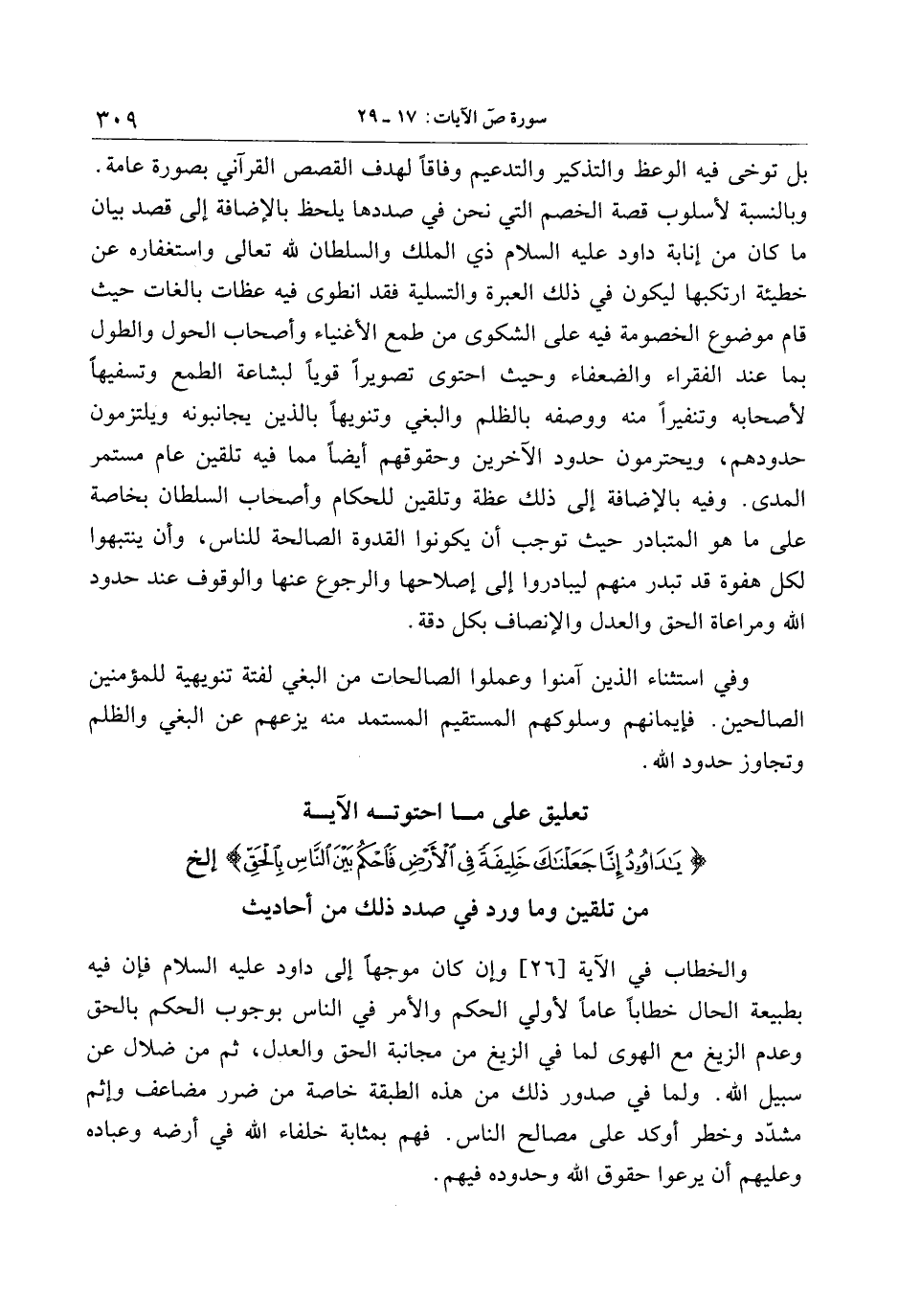 تعليق على ما احتوته الآية يا داوُدُ إِنَّا جَعَلْناكَ خَلِيفَةً فِي الْأَرْضِ فَاحْكُمْ بَيْنَ النَّاسِ بِالْحَقِّ إلخ من تلقين وما ورد في صدد ذلك من أحاديث