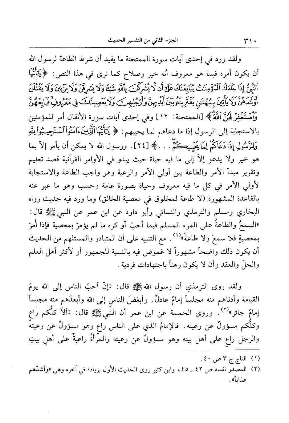 «السمع والطاعة على المرء المسلم فيما أحبّ أو كره ما لم يؤمر بمعصية فإذا أمر بمعصية فلا سمع ولا طاعة» «1» . مع التنبيه على أن المتبادر والمستلهم من الحديث أن يكون ذلك واضحا مشهورا لا غموض فيه بالنسبة للجمهور أو لأكثر أهل العلم والحلّ والعقد وأن لا يكون رهنا باجتهادات فردية.