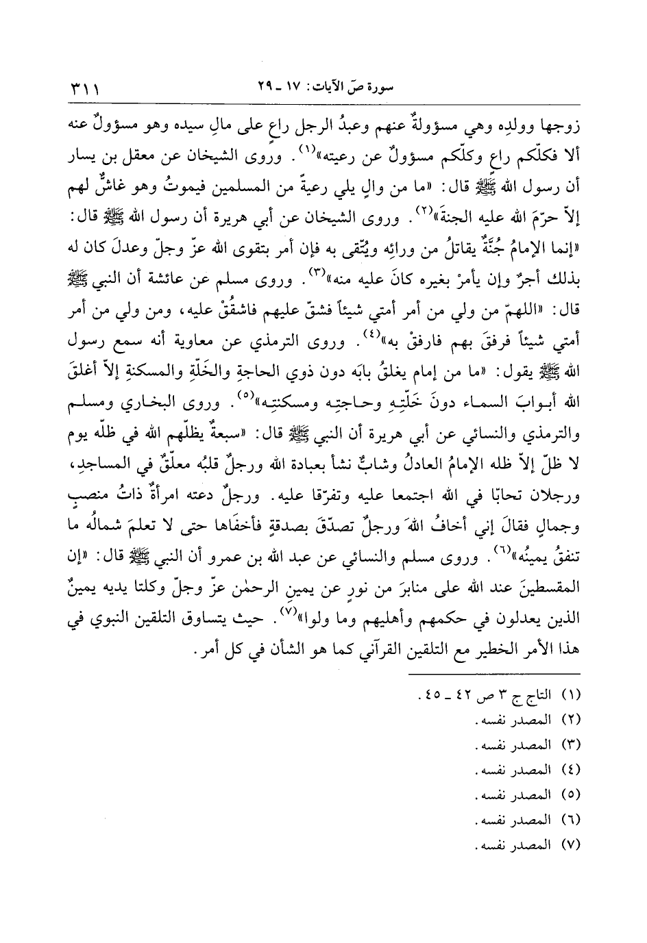 «إنما الإمام جنّة يقاتل من ورائه ويتّقى به فإن أمر بتقوى الله عزّ وجلّ وعدل كان له بذلك أجر وإن يأمر بغيره كان عليه منه» «3» . وروى مسلم عن عائشة أن النبي صلّى الله عليه وسلّم قال: «اللهمّ من ولي من أمر أمتي شيئا فشقّ عليهم فاشقق عليه، ومن ولي من أمر أمتي شيئا فرفق بهم فارفق به» «4» . وروى الترمذي عن معاوية أنه سمع رسول الله صلّى الله عليه وسلّم يقول: «ما من إمام يغلق بابه دون ذوي الحاجة والخلّة والمسكنة إلّا أغلق الله أبواب السماء دون خلّته وحاجته ومسكنته» «5» . وروى البخاري ومسلم والترمذي والنسائي عن أبي هريرة أن النبي صلّى الله عليه وسلّم قال: «سبعة يظلّهم الله في ظلّه يوم لا ظلّ إلّا ظله الإمام العادل وشابّ نشأ بعبادة الله ورجل قلبه معلّق في المساجد، ورجلان تحابّا في الله اجتمعا عليه وتفرّقا عليه. ورجل دعته امرأة ذات منصب وجمال فقال إني أخاف الله ورجل تصدّق بصدقة فأخفاها حتى لا تعلم شماله ما تنفق يمينه» «6» . وروى مسلم والنسائي عن عبد الله بن عمرو أن النبي صلّى الله عليه وسلّم قال: «إن المقسطين عند الله على منابر من نور عن يمين الرحمن عزّ وجلّ وكلتا يديه يمين الذين يعدلون في حكمهم وأهليهم وما ولوا» «7» . حيث يتساوق التلقين النبوي في هذا الأمر الخطير مع التلقين القرآني كما هو الشأن في كل أمر.