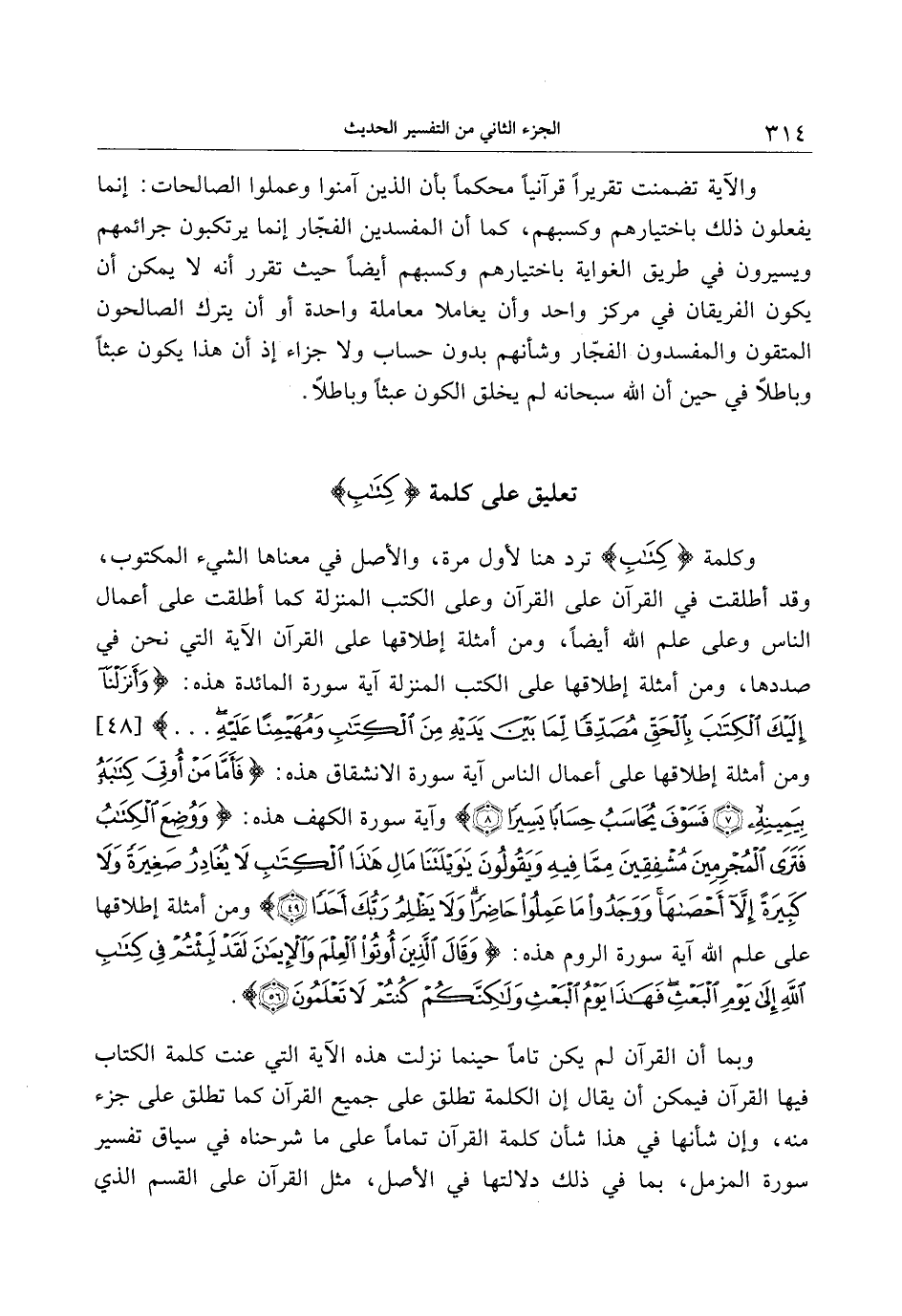 وبما أن القرآن لم يكن تاما حينما نزلت هذه الآية التي عنت كلمة الكتاب فيها القرآن فيمكن أن يقال إن الكلمة تطلق على جميع القرآن كما تطلق على جزء منه، وإن شأنها في هذا شأن كلمة القرآن تماما على ما شرحناه في سياق تفسير سورة المزمل، بما في ذلك دلالتها في الأصل، مثل القرآن على القسم الذي