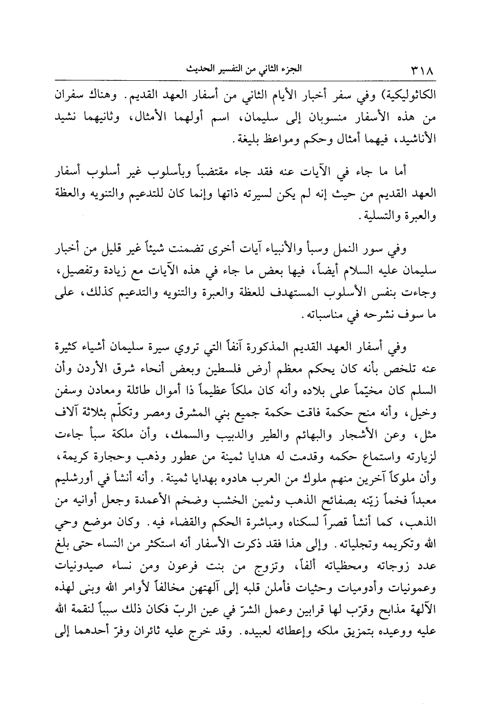 الكاثوليكية) وفي سفر أخبار الأيام الثاني من أسفار العهد القديم. وهناك سفران من هذه الأسفار منسوبان إلى سليمان، اسم أولهما الأمثال، وثانيهما نشيد الأناشيد، فيهما أمثال وحكم ومواعظ بليغة.