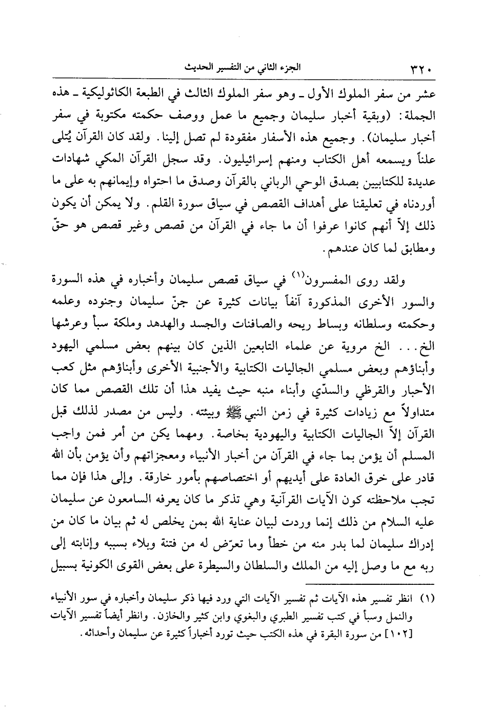 عشر من سفر الملوك الأول- وهو سفر الملوك الثالث في الطبعة الكاثوليكية- هذه الجملة: (وبقية أخبار سليمان وجميع ما عمل ووصف حكمته مكتوبة في سفر أخبار سليمان) . وجميع هذه الأسفار مفقودة لم تصل إلينا. ولقد كان القرآن يتلى علنا ويسمعه أهل الكتاب ومنهم إسرائيليون. وقد سجل القرآن المكي شهادات عديدة للكتابيين بصدق الوحي الرباني بالقرآن وصدق ما احتواه وإيمانهم به على ما أوردناه في تعليقنا على أهداف القصص في سياق سورة القلم. ولا يمكن أن يكون ذلك إلّا أنهم كانوا عرفوا أن ما جاء في القرآن من قصص وغير قصص هو حقّ ومطابق لما كان عندهم.
