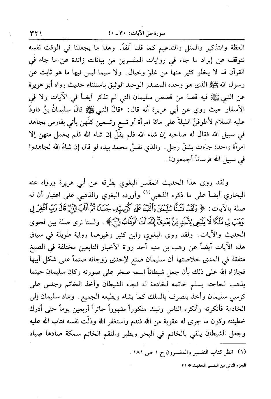 العظة والتذكير والمثل والتدعيم كما قلنا آنفا. وهذا ما يجعلنا في الوقت نفسه نتوقف عن إيراد ما جاء في روايات المفسرين من بيانات زائدة عن ما جاء في القرآن قد لا يخلو كثير منها من غلوّ وخيال. ولا سيما ليس فيها ما هو ثابت عن رسول الله صلّى الله عليه وسلّم الذي هو وحده المصدر الوحيد الوثيق باستثناء حديث رواه أبو هريرة عن النبي صلّى الله عليه وسلّم فيه قصة من قصص سليمان التي لم تذكر أيضا في الآيات ولا في الأسفار حيث روي عن أبي هريرة أنه قال: «قال النبي صلّى الله عليه وسلّم قال سليمان بن داود عليه السلام لأطوفنّ الليلة على مائة امرأة أو تسع وتسعين كلّهن يأتي بفارس يجاهد في سبيل الله فقال له صاحبه إن شاء الله فلم يقل إن شاء الله فلم يحمل منهن إلا امرأة واحدة جاءت بشقّ رجل. والذي نفس محمد بيده لو قال إن شاء الله لجاهدوا في سبيل الله فرسانا أجمعون» .