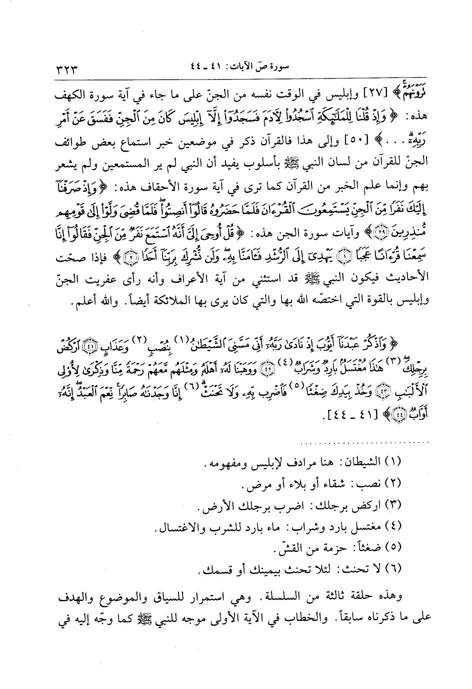 وَاذْكُرْ عَبْدَنا أَيُّوبَ إِذْ نادى رَبَّهُ أَنِّي مَسَّنِيَ الشَّيْطانُ (1) بِنُصْبٍ (2) وَعَذابٍ (41) ارْكُضْ بِرِجْلِكَ (3) هذا مُغْتَسَلٌ بارِدٌ وَشَرابٌ (4) (42) وَوَهَبْنا لَهُ أَهْلَهُ وَمِثْلَهُمْ مَعَهُمْ رَحْمَةً مِنَّا وَذِكْرى لِأُولِي الْأَلْبابِ (43) وَخُذْ بِيَدِكَ ضِغْثاً (5) فَاضْرِبْ بِهِ وَلا تَحْنَثْ (6) إِنَّا وَجَدْناهُ صابِراً نِعْمَ الْعَبْدُ إِنَّهُ أَوَّابٌ (44) [41- 44] .