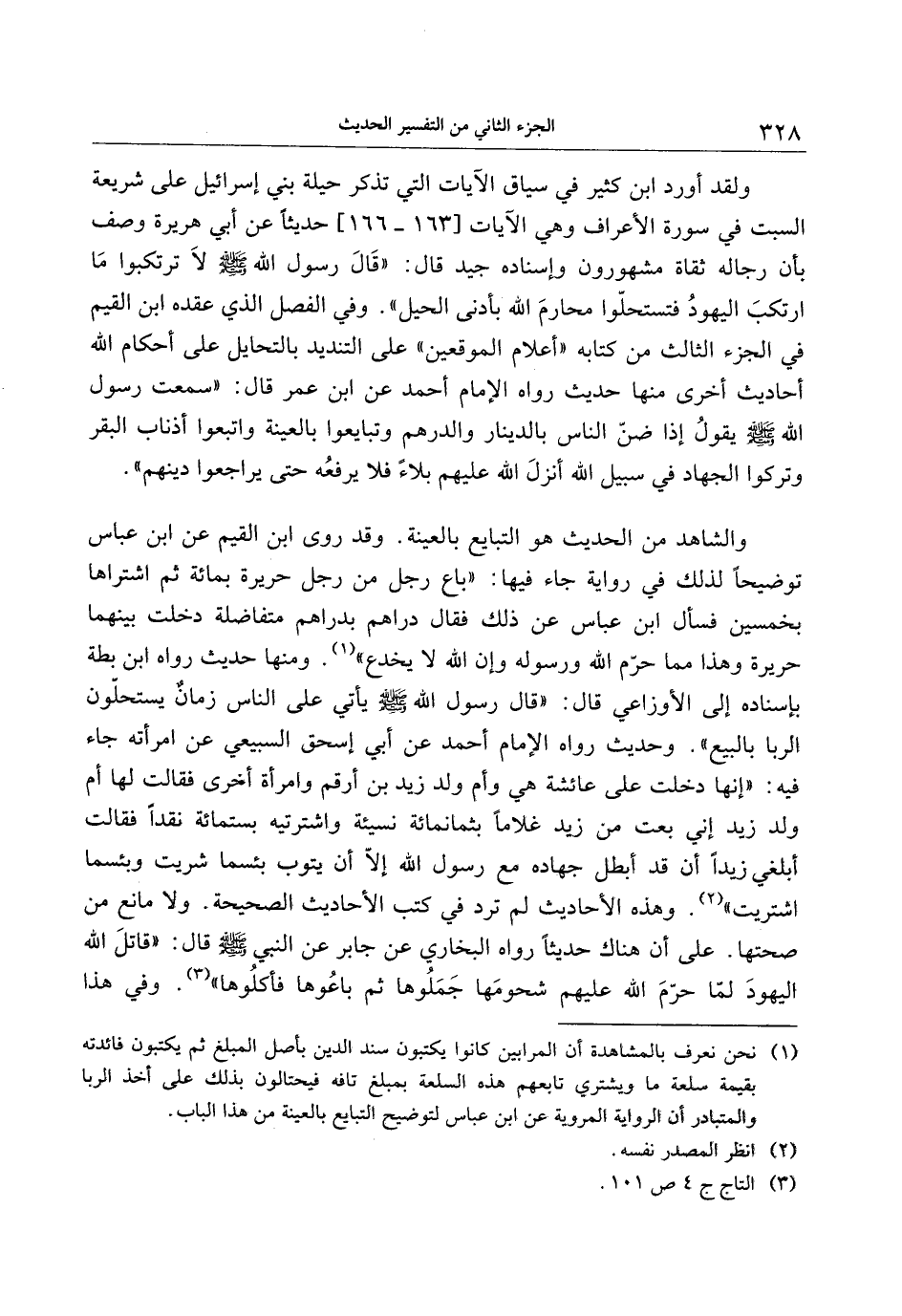 ولقد أورد ابن كثير في سياق الآيات التي تذكر حيلة بني إسرائيل على شريعة السبت في سورة الأعراف وهي الآيات [163- 166] حديثا عن أبي هريرة وصف بأن رجاله ثقاة مشهورون وإسناده جيد قال: «قال رسول الله صلّى الله عليه وسلّم لا ترتكبوا ما ارتكب اليهود فتستحلّوا محارم الله بأدنى الحيل» . وفي الفصل الذي عقده ابن القيم في الجزء الثالث من كتابه «أعلام الموقعين» على التنديد بالتحايل على أحكام الله أحاديث أخرى منها حديث رواه الإمام أحمد عن ابن عمر قال: «سمعت رسول الله صلّى الله عليه وسلّم يقول إذا ضنّ الناس بالدينار والدرهم وتبايعوا بالعينة واتبعوا أذناب البقر وتركوا الجهاد في سبيل الله أنزل الله عليهم بلاء فلا يرفعه حتى يراجعوا دينهم» .