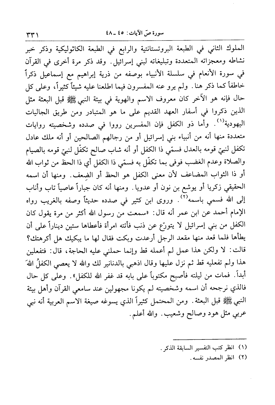 قالت: لا ولكن هذا عمل لم أعمله قط وإنما حملني عليه الحاجة، قال: فتفعلين هذا ولم تفعليه قط ثم نزل عليها وقال اذهبي بالدنانير لك والله لا يعصي الكفل الله أبدا. فمات من ليلته فأصبح مكتوبا على بابه قد غفر الله للكفل» . وعلى كل حال فالذي نرجحه أن اسمه وشخصيته لم يكونا مجهولين عند سامعي القرآن وأهل بيئة النبي صلّى الله عليه وسلّم قبل البعثة. ومن المحتمل كثيرا الذي يسوغه صيغة الاسم العربية أنه نبي عربي مثل هود وصالح وشعيب. والله أعلم.