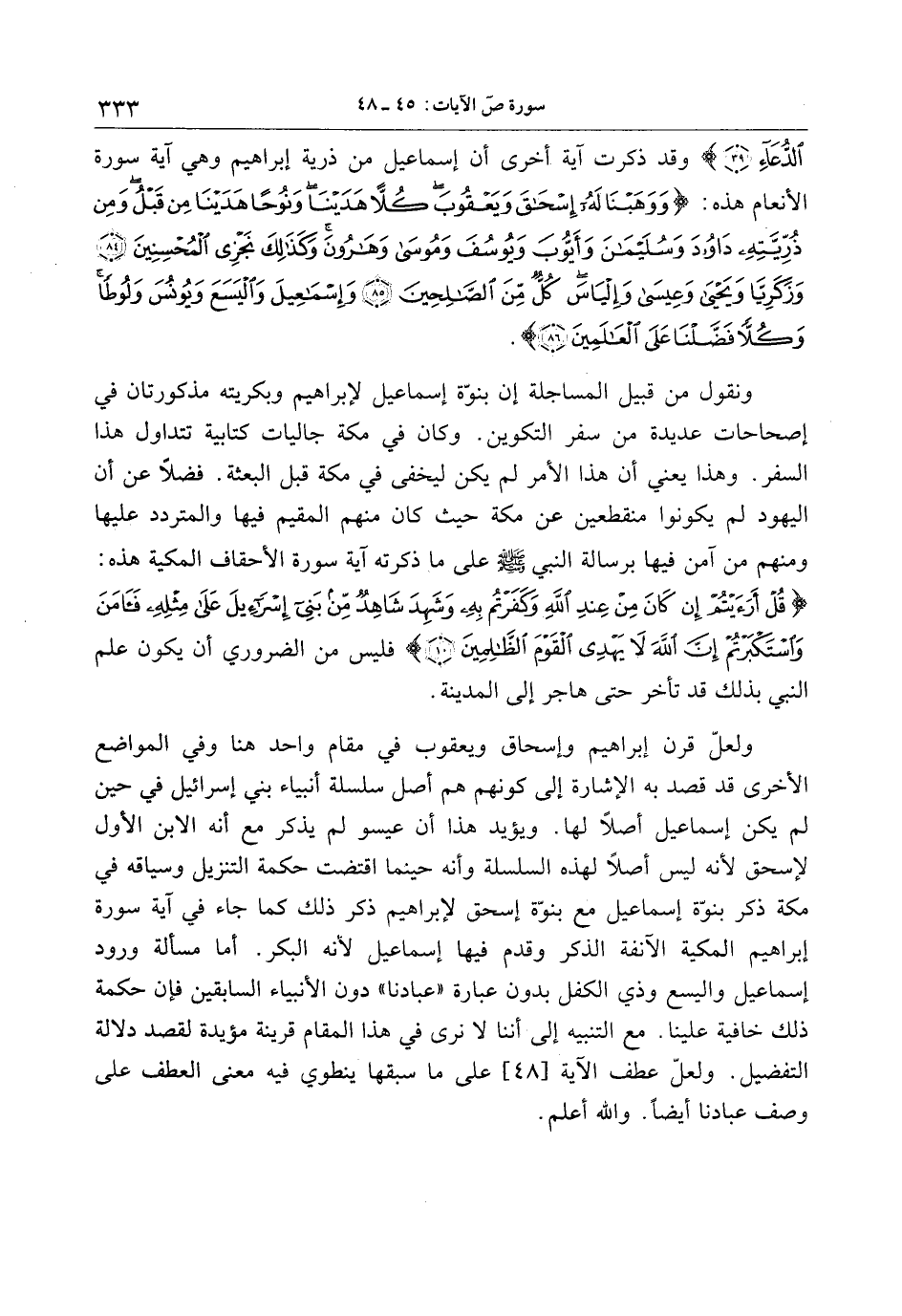 ولعلّ قرن إبراهيم وإسحاق ويعقوب في مقام واحد هنا وفي المواضع الأخرى قد قصد به الإشارة إلى كونهم هم أصل سلسلة أنبياء بني إسرائيل في حين لم يكن إسماعيل أصلا لها. ويؤيد هذا أن عيسو لم يذكر مع أنه الابن الأول لإسحق لأنه ليس أصلا لهذه السلسلة وأنه حينما اقتضت حكمة التنزيل وسياقه في مكة ذكر بنوّة إسماعيل مع بنوّة إسحق لإبراهيم ذكر ذلك كما جاء في آية سورة إبراهيم المكية الآنفة الذكر وقدم فيها إسماعيل لأنه البكر. أما مسألة ورود إسماعيل واليسع وذي الكفل بدون عبارة «عبادنا» دون الأنبياء السابقين فإن حكمة ذلك خافية علينا. مع التنبيه إلى أننا لا نرى في هذا المقام قرينة مؤيدة لقصد دلالة التفضيل. ولعلّ عطف الآية [48] على ما سبقها ينطوي فيه معنى العطف على وصف عبادنا أيضا. والله أعلم.