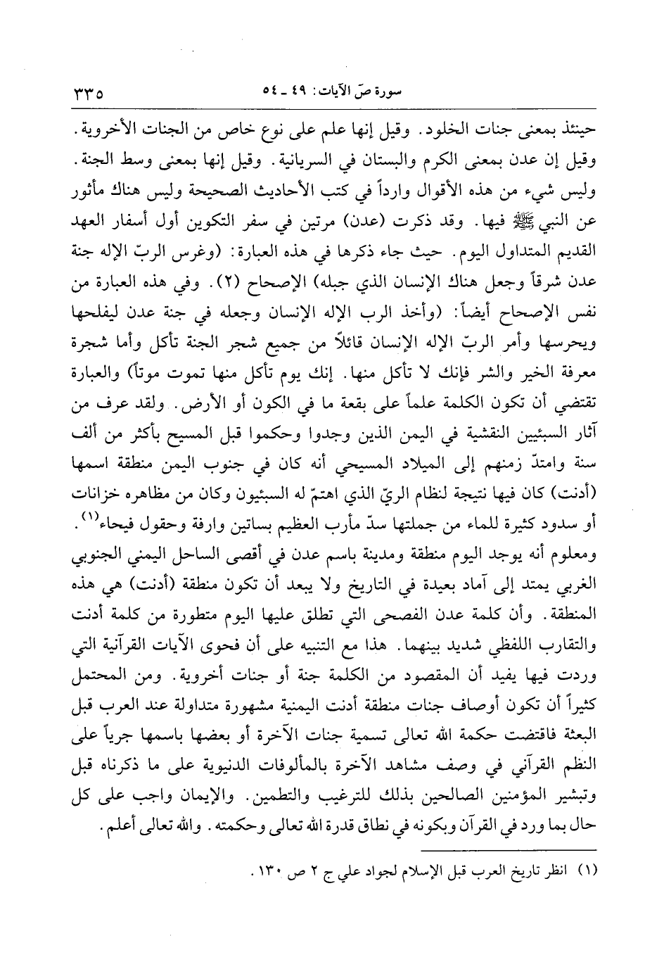 وليس شيء من هذه الأقوال واردا في كتب الأحاديث الصحيحة وليس هناك مأثور عن النبي صلّى الله عليه وسلّم فيها. وقد ذكرت (عدن) مرتين في سفر التكوين أول أسفار العهد القديم المتداول اليوم. حيث جاء ذكرها في هذه العبارة: (وغرس الربّ الإله جنة عدن شرقا وجعل هناك الإنسان الذي جبله) الإصحاح (2) . وفي هذه العبارة من نفس الإصحاح أيضا: (وأخذ الرب الإله الإنسان وجعله في جنة عدن ليفلحها ويحرسها وأمر الربّ الإله الإنسان قائلا من جميع شجر الجنة تأكل وأما شجرة معرفة الخير والشر فإنك لا تأكل منها. إنك يوم تأكل منها تموت موتا) والعبارة تقتضي أن تكون الكلمة علما على بقعة ما في الكون أو الأرض. ولقد عرف من آثار السبئيين النقشية في اليمن الذين وجدوا وحكموا قبل المسيح بأكثر من ألف سنة وامتدّ زمنهم إلى الميلاد المسيحي أنه كان في جنوب اليمن منطقة اسمها (أدنت) كان فيها نتيجة لنظام الريّ الذي اهتمّ له السبئيون وكان من مظاهره خزانات أو سدود كثيرة للماء من جملتها سدّ مأرب العظيم بساتين وارفة وحقول فيحاء «1» .