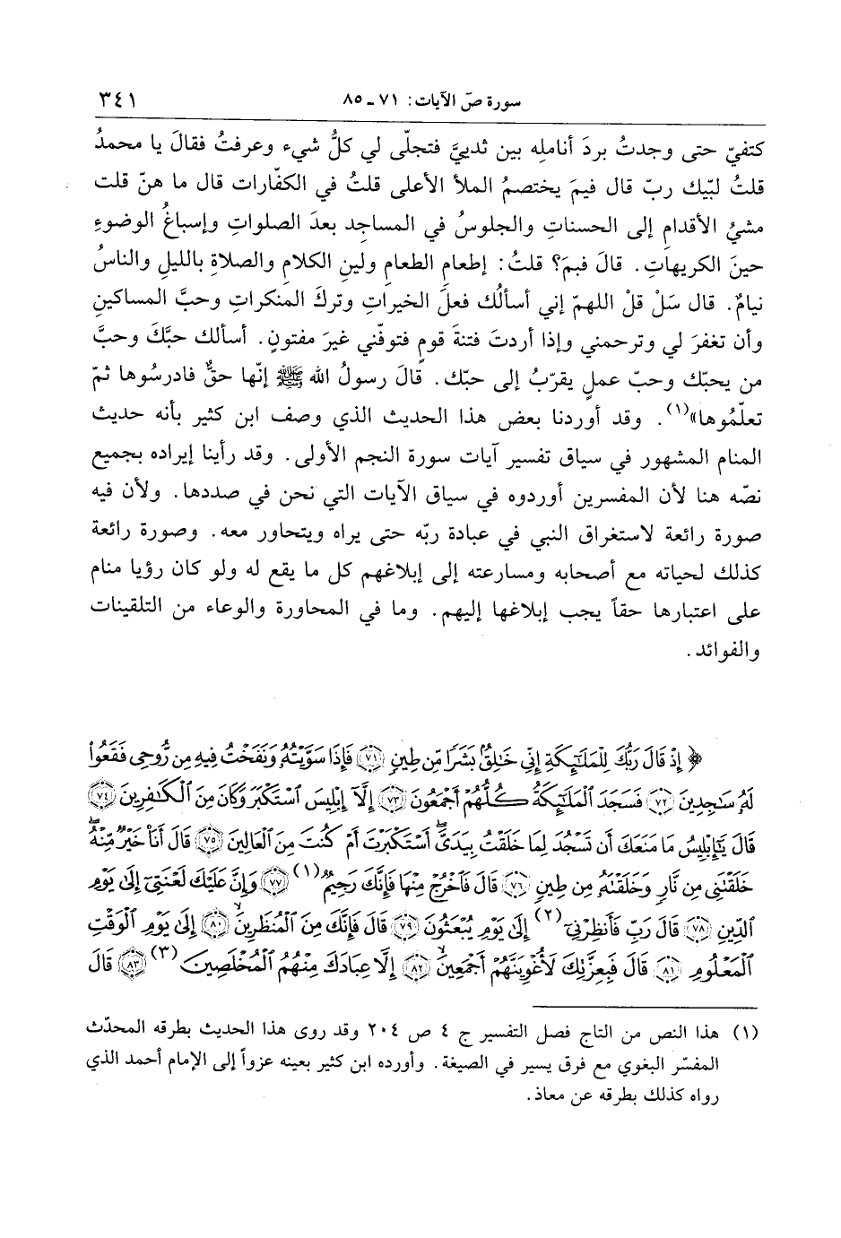 (1) هذا النص من التاج فصل التفسير ج 4 ص 204 وقد روى هذا الحديث بطرقه المحدّث المفسّر البغوي مع فرق يسير في الصيغة. وأورده ابن كثير بعينه عزوا إلى الإمام أحمد الذي رواه كذلك بطرقه عن معاذ.