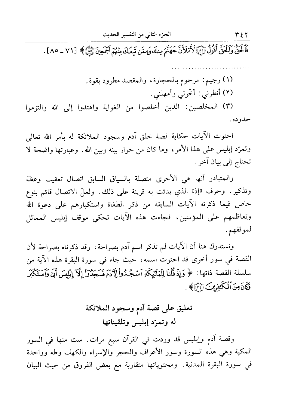 فَالْحَقُّ وَالْحَقَّ أَقُولُ (84) لَأَمْلَأَنَّ جَهَنَّمَ مِنْكَ وَمِمَّنْ تَبِعَكَ مِنْهُمْ أَجْمَعِينَ (85) [71- 85] .