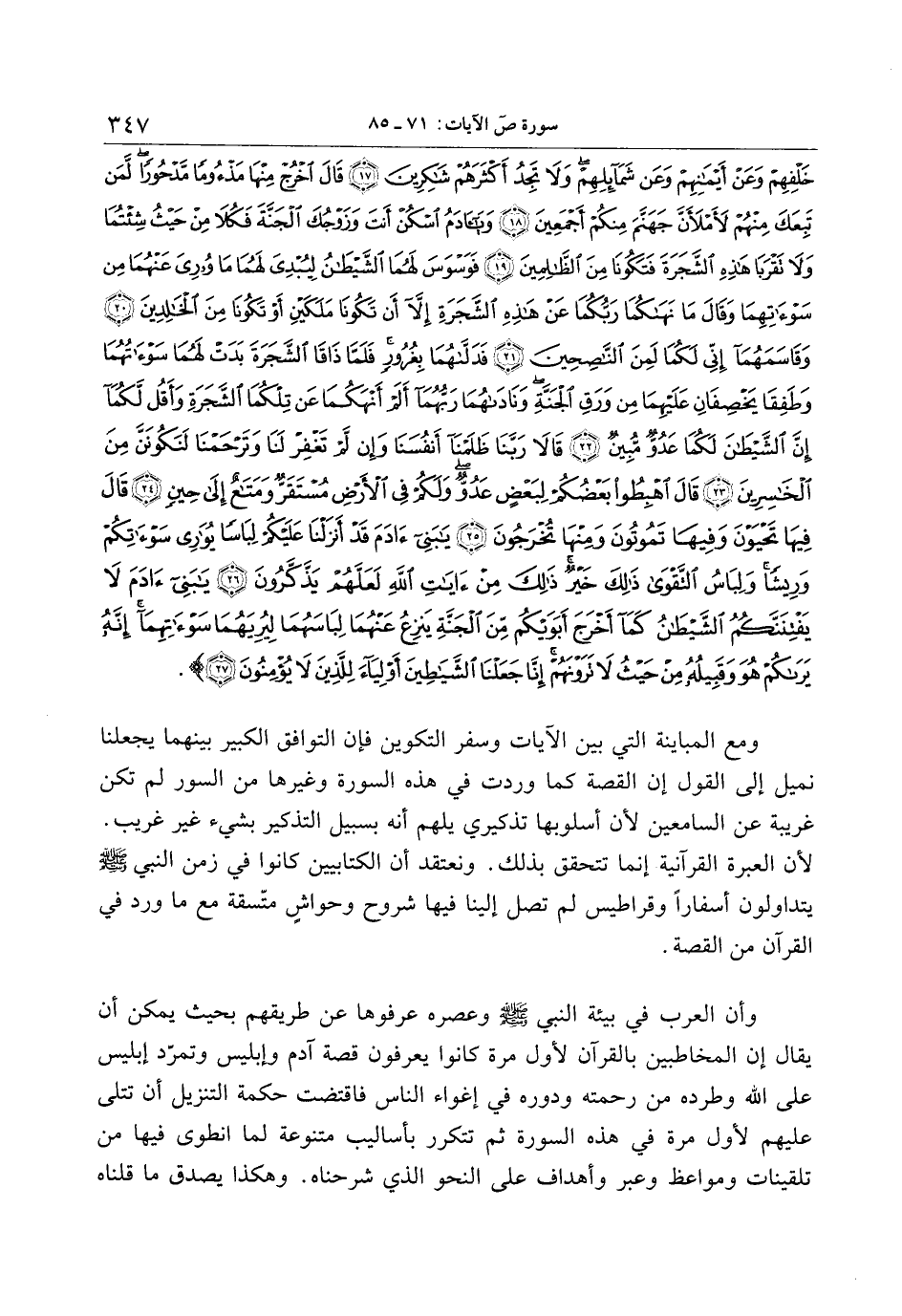 وأن العرب في بيئة النبي صلّى الله عليه وسلّم وعصره عرفوها عن طريقهم بحيث يمكن أن يقال إن المخاطبين بالقرآن لأول مرة كانوا يعرفون قصة آدم وإبليس وتمرّد إبليس على الله وطرده من رحمته ودوره في إغواء الناس فاقتضت حكمة التنزيل أن تتلى عليهم لأول مرة في هذه السورة ثم تتكرر بأساليب متنوعة لما انطوى فيها من تلقينات ومواعظ وعبر وأهداف على النحو الذي شرحناه. وهكذا يصدق ما قلناه