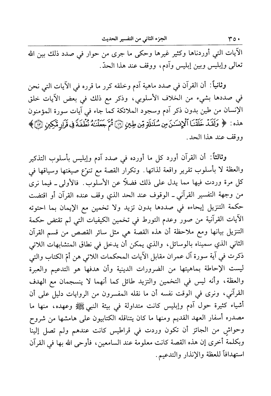 وثالثا: أن القرآن أورد كل ما أورده في صدد آدم وإبليس بأسلوب التذكير والعظة لا بأسلوب تقرير واقعة لذاتها. وتكرار القصة مع تنوّع صيغتها وسياقها في كل مرة وردت فيها مما يدل على ذلك فضلا عن الأسلوب. فالأولى- فيما نرى من وجهة التفسير القرآني- الوقوف عند الحد الذي وقف عنده القرآن أو اقتضت حكمة التنزيل إيحاءه في صددها بدون تزيد ولا تخمين مع الإيمان بما احتوته الآيات القرآنية من صور وعدم التورط في تخمين الكيفيات التي لم تقتض حكمة التنزيل بيانها ومع ملاحظة أن هذه القصة هي مثل سائر القصص من قسم القرآن الثاني الذي سميناه بالوسائل، والذي يمكن أن يدخل في نطاق المتشابهات اللاتي ذكرت في آية سورة آل عمران مقابل الآيات المحكمات اللاتي هن أمّ الكتاب والتي ليست الإحاطة بماهيتها من الضرورات الدينية وأن هدفها هو التدعيم والعبرة والعظة، وأنه ليس في التخمين والتزيد طائل كما أنهما لا ينسجمان مع الهدف القرآني، ونرى في الوقت نفسه أن ما نقله المفسرون من الروايات دليل على أن أشياء كثيرة حول آدم وإبليس كانت متداولة في بيئة النبي صلّى الله عليه وسلّم وعهده، منها ما مصدره أسفار العهد القديم ومنها ما كان يتناقله الكتابيون على هامشها من شروح وحواش من الجائز أن تكون وردت في قراطيس كانت عندهم ولم تصل إلينا وبكلمة أخرى إن هذه القصة كانت معلومة عند السامعين، فأوحى الله بها في القرآن استهدافا للعظة والإنذار والتدعيم.