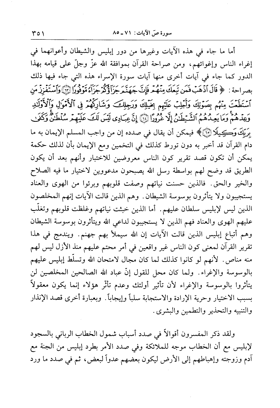 أما ما جاء في هذه الآيات وغيرها من دور إبليس والشيطان وأعوانهما في إغراء الناس وإغوائهم، ومن صراحة القرآن بموافقة الله عزّ وجلّ على قيامه بهذا الدور كما جاء في آيات أخرى منها آيات سورة الإسراء هذه التي جاء فيها ذلك بصراحة: قالَ اذْهَبْ فَمَنْ تَبِعَكَ مِنْهُمْ فَإِنَّ جَهَنَّمَ جَزاؤُكُمْ جَزاءً مَوْفُوراً (63) وَاسْتَفْزِزْ مَنِ اسْتَطَعْتَ مِنْهُمْ بِصَوْتِكَ وَأَجْلِبْ عَلَيْهِمْ بِخَيْلِكَ وَرَجِلِكَ وَشارِكْهُمْ فِي الْأَمْوالِ وَالْأَوْلادِ وَعِدْهُمْ وَما يَعِدُهُمُ الشَّيْطانُ إِلَّا غُرُوراً (64) إِنَّ عِبادِي لَيْسَ لَكَ عَلَيْهِمْ سُلْطانٌ وَكَفى بِرَبِّكَ وَكِيلًا (65)