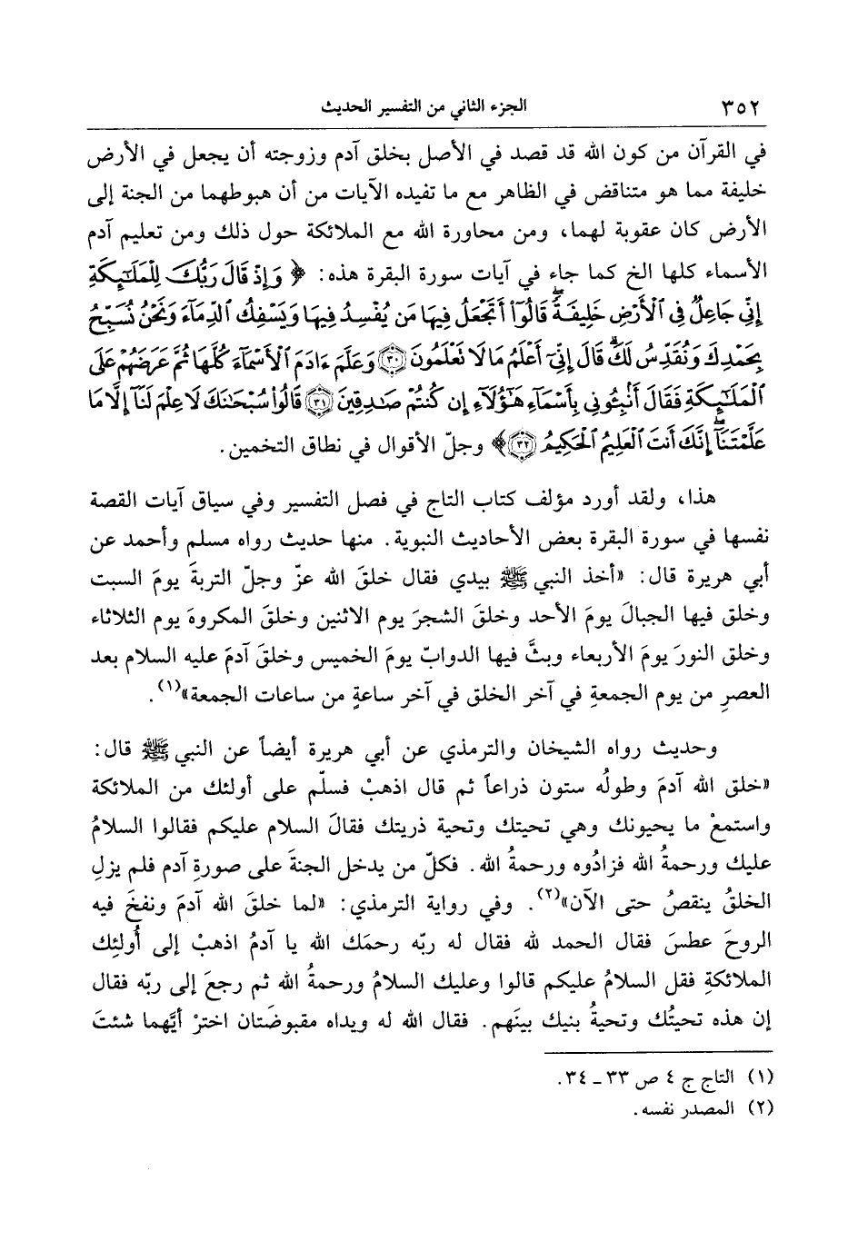 هذا، ولقد أورد مؤلف كتاب التاج في فصل التفسير وفي سياق آيات القصة نفسها في سورة البقرة بعض الأحاديث النبوية. منها حديث رواه مسلم وأحمد عن أبي هريرة قال: «أخذ النبي صلّى الله عليه وسلّم بيدي فقال خلق الله عزّ وجلّ التربة يوم السبت وخلق فيها الجبال يوم الأحد وخلق الشجر يوم الاثنين وخلق المكروه يوم الثلاثاء وخلق النور يوم الأربعاء وبثّ فيها الدوابّ يوم الخميس وخلق آدم عليه السلام بعد العصر من يوم الجمعة في آخر الخلق في آخر ساعة من ساعات الجمعة» «1» .