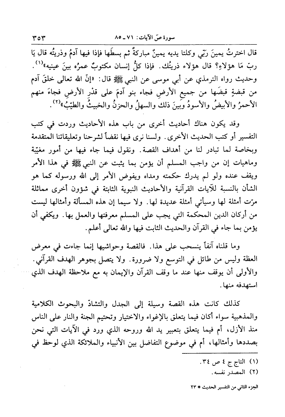كذلك كانت هذه القصة وسيلة إلى الجدل والتشادّ والبحوث الكلامية والمذهبية سواء أكان فيما يتعلق بالإغواء والاختيار وتحتيم الجنة والنار على الناس منذ الأزل، أم فيما يتعلق بتعبير يد الله وروحه الذي ورد في الآيات التي نحن بصددها وأمثالها، أم في موضوع التفاضل بين الأنبياء والملائكة الذي لو حظ في