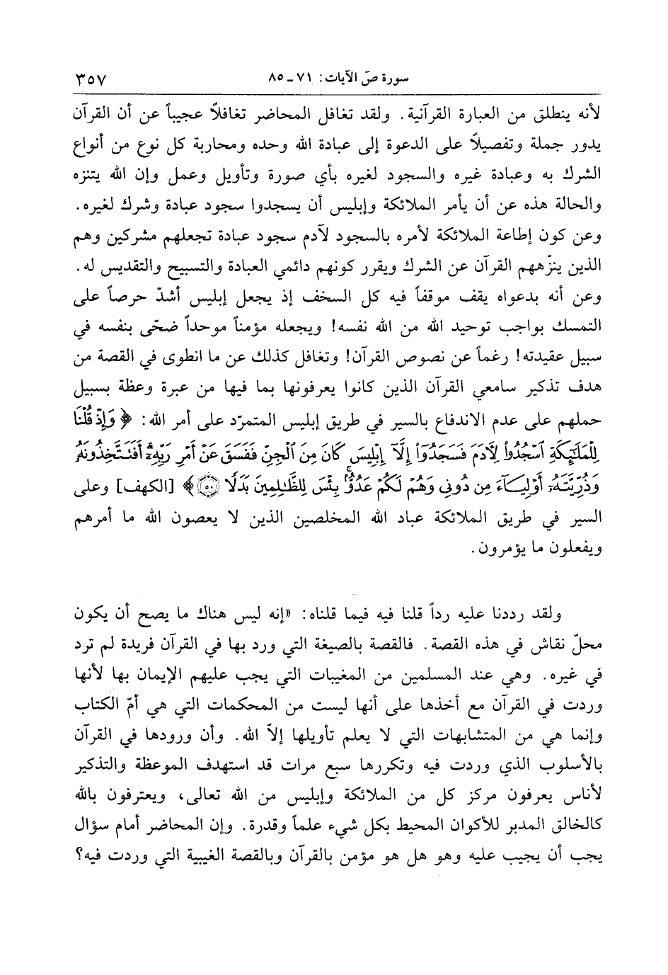 ولقد رددنا عليه ردا قلنا فيه فيما قلنا: «إنه ليس هناك ما يصح أن يكون محلّ نقاش في هذه القصة. فالقصة بالصيغة التي ورد بها في القرآن فريدة لم ترد في غيره. وهي عند المسلمين من المغيبات التي يجب عليهم الإيمان بها لأنها وردت في القرآن مع أخذها على أنها ليست من المحكمات التي هي أمّ الكتاب وإنما هي من المتشابهات التي لا يعلم تأويلها إلّا الله. وأن ورودها في القرآن بالأسلوب الذي وردت فيه وتكررها سبع مرات قد استهدف الموعظة والتذكير لأناس يعرفون مركز كل من الملائكة وإبليس من الله تعالى، ويعترفون بالله كالخالق المدبر للأكوان المحيط بكل شيء علما وقدرة. وإن المحاضر أمام سؤال يجب أن يجيب عليه وهو هل هو مؤمن بالقرآن وبالقصة الغيبية التي وردت فيه؟