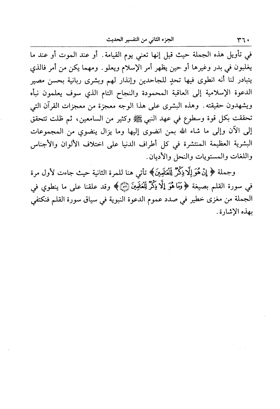 وجملة إِنْ هُوَ إِلَّا ذِكْرٌ لِلْعالَمِينَ تأتي هنا للمرة الثانية حيث جاءت لأول مرة في سورة القلم بصيغة وَما هُوَ إِلَّا ذِكْرٌ لِلْعالَمِينَ (52) وقد علقنا على ما ينطوي في الجملة من مغزى خطير في صدد عموم الدعوة النبوية في سياق سورة القلم فنكتفي بهذه الإشارة.