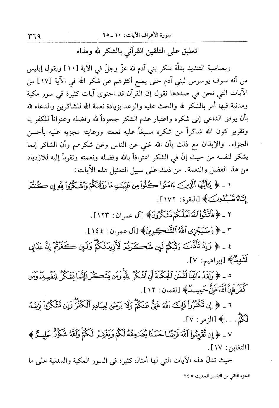 وبمناسبة التنديد بقلّة شكر بني آدم لله عزّ وجلّ في الآية [10] وبقول إبليس من أنه سوف يوسوس لبني آدم حتى يمنع أكثرهم عن شكر الله في الآية [17] من الآيات التي نحن في صددها نقول إن القرآن قد احتوى آيات كثيرة في سورة مكية ومدنية فيها أمر بالشكر لله والحث عليه والوعد بزيادة نعمة الله للشاكرين والدعاء لله بأن يوفق الداعي إلى شكره واعتبار عدم الشكر جحودا لله وفضله وعنوانا للكفر به وتقرير كون الله شاكرا من شكره مسبغا عليه نعمته ورعايته مجزيه عليه بأحسن الجزاء. والإيذان مع ذلك بأن الله غني عن الناس وعن شكرهم وأن الشاكر إنما يشكر لنفسه من حيث إنّ في الشكر اعترافا بالله وفضله ونعمته وتقربا إليه للازدياد من هذا الفضل والنعمة. من ذلك على سبيل التمثيل هذه الآيات: