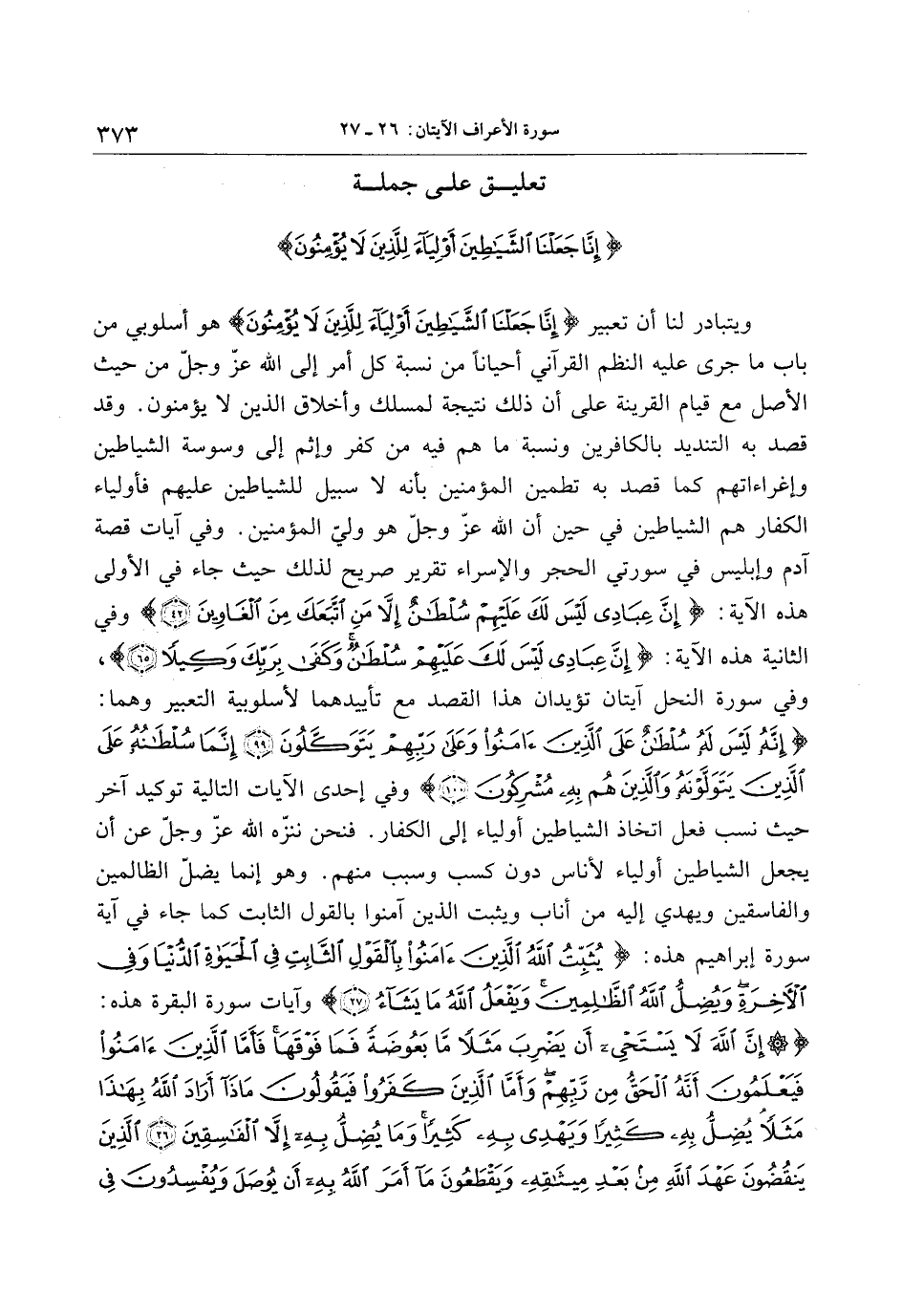 ويتبادر لنا أن تعبير إِنَّا جَعَلْنَا الشَّياطِينَ أَوْلِياءَ لِلَّذِينَ لا يُؤْمِنُونَ هو أسلوبي من باب ما جرى عليه النظم القرآني أحيانا من نسبة كل أمر إلى الله عزّ وجلّ من حيث الأصل مع قيام القرينة على أن ذلك نتيجة لمسلك وأخلاق الذين لا يؤمنون. وقد قصد به التنديد بالكافرين ونسبة ما هم فيه من كفر وإثم إلى وسوسة الشياطين وإغراءاتهم كما قصد به تطمين المؤمنين بأنه لا سبيل للشياطين عليهم فأولياء الكفار هم الشياطين في حين أن الله عزّ وجلّ هو وليّ المؤمنين. وفي آيات قصة آدم وإبليس في سورتي الحجر والإسراء تقرير صريح لذلك حيث جاء في الأولى هذه الآية: إِنَّ عِبادِي لَيْسَ لَكَ عَلَيْهِمْ سُلْطانٌ إِلَّا مَنِ اتَّبَعَكَ مِنَ الْغاوِينَ (42) وفي الثانية هذه الآية: إِنَّ عِبادِي لَيْسَ لَكَ عَلَيْهِمْ سُلْطانٌ وَكَفى بِرَبِّكَ وَكِيلًا (65) ، وفي سورة النحل آيتان تؤيدان هذا القصد مع تأييدهما لأسلوبية التعبير وهما: