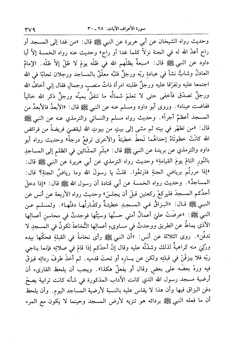 وحديث رواه الشيخان عن أبي هريرة عن النبي صلّى الله عليه وسلّم قال: «من غدا إلى المسجد أو راح أعدّ الله له في الجنة نزلا كلما غدا أو راح» وحديث عنه رواه الخمسة إلّا أبا داود عن النبي صلّى الله عليه وسلّم قال: «سبعة يظلّهم الله في ظلّه يوم لا ظلّ إلّا ظلّه. الإمام العادل وشابّ نشأ في عبادة ربّه ورجل قلبه معلّق بالمساجد ورجلان تحابّا في الله اجتمعا عليه وتفرّقا عليه ورجل طلبته امرأة ذات منصب وجمال فقال إني أخاف الله ورجل تصدّق فأخفى حتى لا تعلم شماله ما تنفق يمينه ورجل ذكر الله خاليا ففاضت عيناه» . وروى أبو داود ومسلم عنه عن النبي صلّى الله عليه وسلّم قال: «الأبعد فالأبعد من المسجد أعظم أجرا» . وحديث رواه مسلم والنسائي والترمذي عنه عن النبي صلّى الله عليه وسلّم قال: «من تطهّر في بيته ثم مشى إلى بيت من بيوت الله ليقضي فريضة من فرائض الله كانت خطوتاه إحداهما تحطّ خطيئة والأخرى ترفع درجة» وحديث رواه أبو داود والترمذي عن بريدة عن النبي صلّى الله عليه وسلّم قال: «بشّر المشّائين في الظلم إلى المساجد بالنّور التامّ يوم القيامة» وحديث رواه الترمذي عن أبي هريرة عن النبي صلّى الله عليه وسلّم قال: