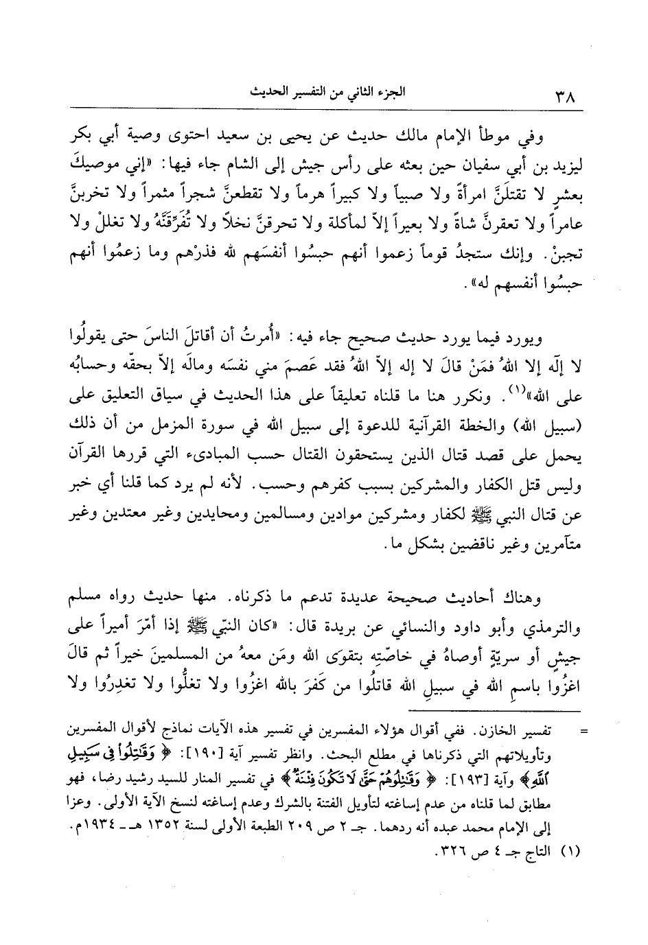 ويورد فيما يورد حديث صحيح جاء فيه: «أمرت أن أقاتل الناس حتى يقولوا لا إله إلا الله فمن قال لا إله إلّا الله فقد عصم مني نفسه وماله إلّا بحقّه وحسابه على الله» «1» . ونكرر هنا ما قلناه تعليقا على هذا الحديث في سياق التعليق على (سبيل الله) والخطة القرآنية للدعوة إلى سبيل الله في سورة المزمل من أن ذلك يحمل على قصد قتال الذين يستحقون القتال حسب المبادئ التي قررها القرآن وليس قتل الكفار والمشركين بسبب كفرهم وحسب. لأنه لم يرد كما قلنا أي خبر عن قتال النبي صلّى الله عليه وسلّم لكفار ومشركين موادين ومسالمين ومحايدين وغير معتدين وغير متآمرين وغير ناقضين بشكل ما.