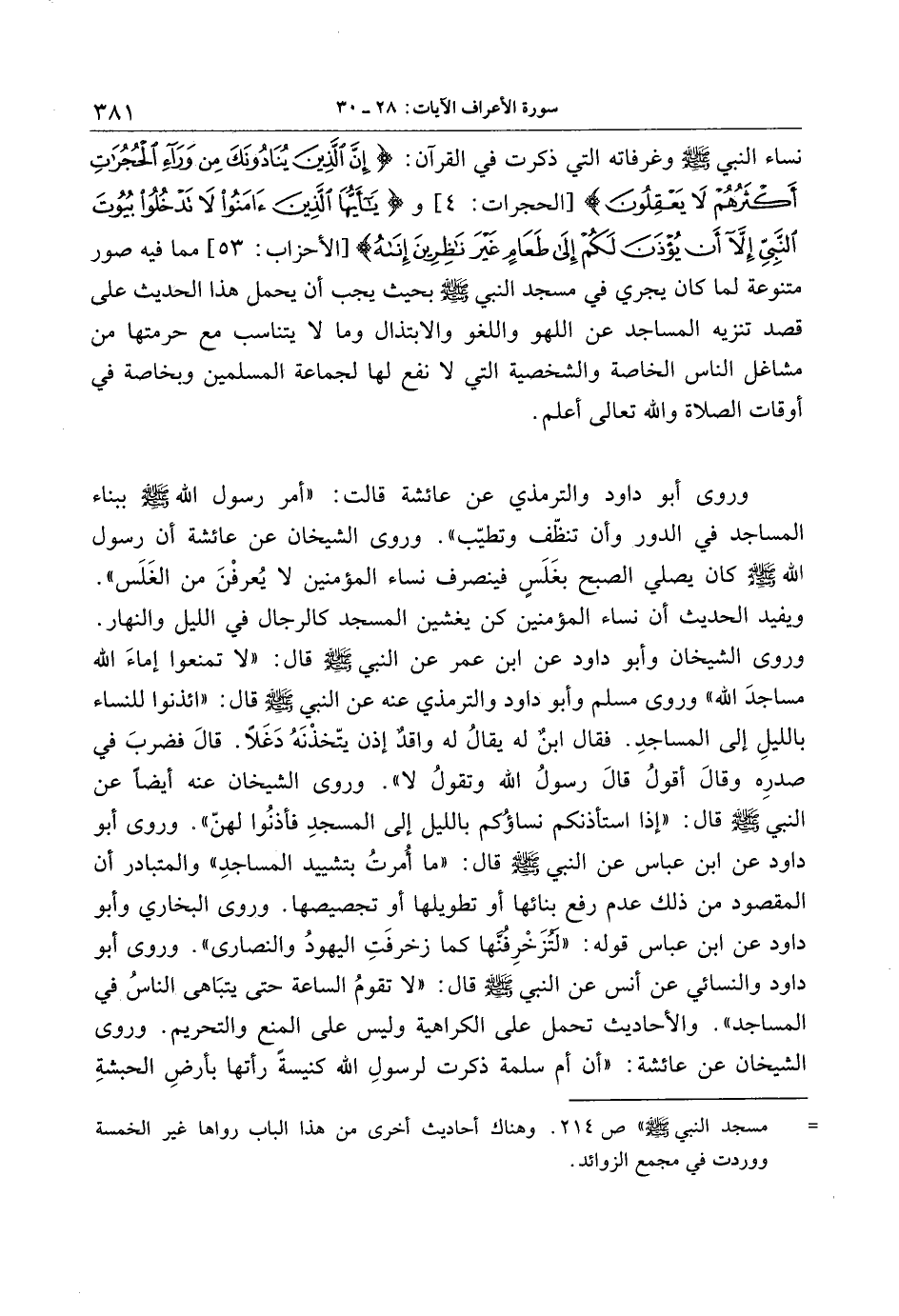 نساء النبي صلّى الله عليه وسلّم وغرفاته التي ذكرت في القرآن: إِنَّ الَّذِينَ يُنادُونَكَ مِنْ وَراءِ الْحُجُراتِ أَكْثَرُهُمْ لا يَعْقِلُونَ [الحجرات: 4] ويا أَيُّهَا الَّذِينَ آمَنُوا لا تَدْخُلُوا بُيُوتَ النَّبِيِّ إِلَّا أَنْ يُؤْذَنَ لَكُمْ إِلى طَعامٍ غَيْرَ ناظِرِينَ إِناهُ [الأحزاب: 53] مما فيه صور متنوعة لما كان يجري في مسجد النبي صلّى الله عليه وسلّم بحيث يجب أن يحمل هذا الحديث على قصد تنزيه المساجد عن اللهو واللغو والابتذال وما لا يتناسب مع حرمتها من مشاغل الناس الخاصة والشخصية التي لا نفع لها لجماعة المسلمين وبخاصة في أوقات الصلاة والله تعالى أعلم.