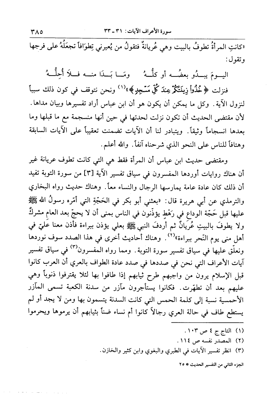 ومقتضى حديث ابن عباس أن المرأة فقط هي التي كانت تطوف عريانة غير أن هناك روايات أوردها المفسرون في سياق تفسير الآية [3] من سورة التوبة تفيد أن ذلك كان عادة عامة يمارسها الرجال والنساء معا. وهناك حديث رواه البخاري والترمذي عن أبي هريرة قال: «بعثني أبو بكر في الحجّة التي أمّره رسول الله صلّى الله عليه وسلّم عليها قبل حجّة الوداع في رهط يؤذّنون في الناس بمنى أن لا يحجّ بعد العام مشرك ولا يطوف بالبيت عريان ثم أردف النبي صلّى الله عليه وسلّم بعلي يؤذن ببراءة فأذن معنا عليّ في أهل منى يوم النّحر ببراءة» «2» . وهناك أحاديث أخرى في هذا الصدد سوف نوردها ونعلّق عليها في سياق تفسير سورة التوبة. ومما رواه المفسرون «3» في سياق تفسير آيات الأعراف التي نحن في صددها في صدد عادة الطواف بالعري أن العرب كانوا قبل الإسلام يرون من واجبهم طرح ثيابهم إذا طافوا بها لئلا يقترفوا ذنوبا وهي عليهم بعد أن تطهّرت. فكانوا يستأجرون مآزر من سدنة الكعبة تسمى المآزر الأحمسية نسبة إلى كلمة الحمس التي كانت السدنة يتسمون بها ومن لا يجد أو لم يستطع طاف في حالة العري رجالا كانوا أم نساء ضنا بثيابهم أن يرموها ويحرموا