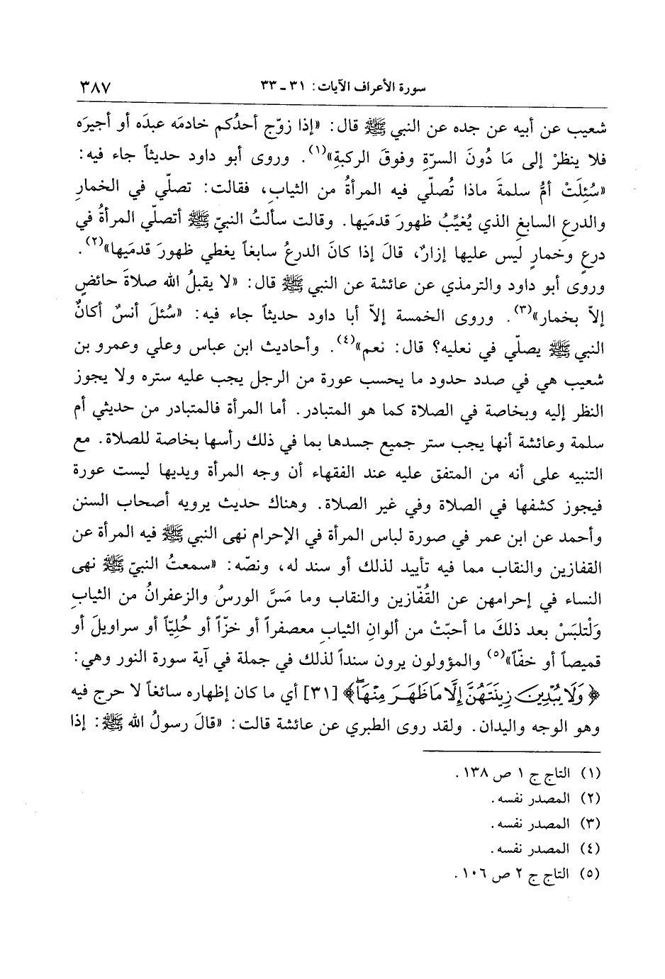«سئلت أمّ سلمة ماذا تصلّي فيه المرأة من الثياب، فقالت: تصلّي في الخمار والدرع السابغ الذي يغيّب ظهور قدميها. وقالت سألت النبيّ صلّى الله عليه وسلّم أتصلّي المرأة في درع وخمار ليس عليها إزار، قال إذا كان الدرع سابغا يغطي ظهور قدميها» «2» . وروى أبو داود والترمذي عن عائشة عن النبي صلّى الله عليه وسلّم قال: «لا يقبل الله صلاة حائض إلّا بخمار» «3» . وروى الخمسة إلّا أبا داود حديثا جاء فيه: «سئل أن أكان النبي صلّى الله عليه وسلّم يصلّي في نعليه؟ قال: نعم» «4» . وأحاديث ابن عباس وعلي وعمرو بن شعيب هي في صدد حدود ما يحسب عورة من الرجل يجب عليه ستره ولا يجوز النظر إليه وبخاصة في الصلاة كما هو المتبادر. أما المرأة فالمتبادر من حديثي أم سلمة وعائشة أنها يجب ستر جميع جسدها بما في ذلك رأسها بخاصة للصلاة. مع التنبيه على أنه من المتفق عليه عند الفقهاء أن وجه المرأة ويديها ليست عورة فيجوز كشفها في الصلاة وفي غير الصلاة. وهناك حديث يرويه أصحاب السنن وأحمد عن ابن عمر في صورة لباس المرأة في الإحرام نهى النبي صلّى الله عليه وسلّم فيه المرأة عن القفازين والنقاب مما فيه تأييد لذلك أو سند له، ونصّه: «سمعت النبي صلّى الله عليه وسلّم نهى النساء في إحرامهن عن القفّازين والنقاب وما مسّ الورس والزعفران من الثياب ولتلبس بعد ذلك ما أحبّت من ألوان الثياب معصفرا أو خزّا أو حليّا أو سراويل أو قميصا أو خفّا» «5» والمؤولون يرون سندا لذلك في جملة في آية سورة النور وهي: