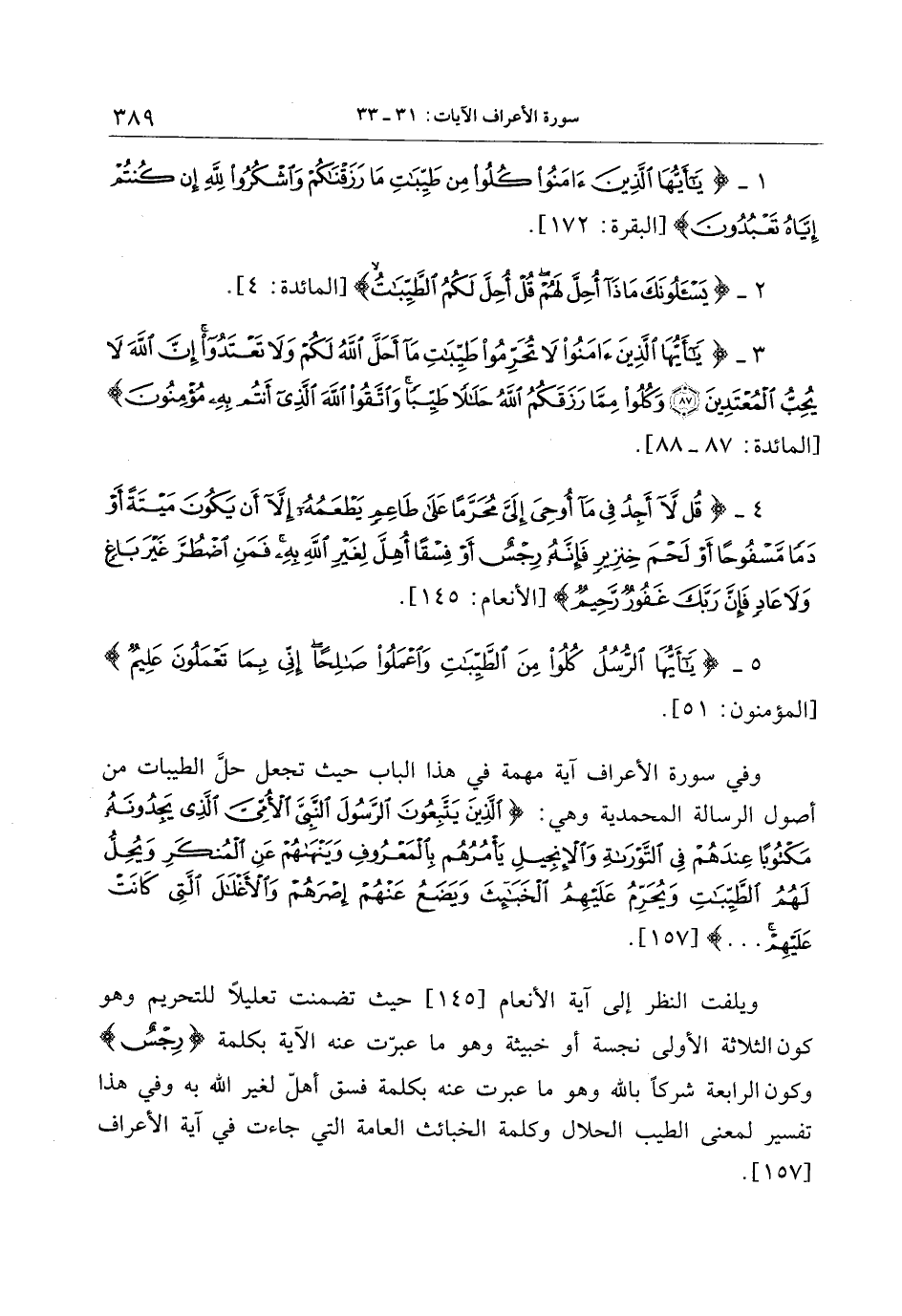 وفي سورة الأعراف آية مهمة في هذا الباب حيث تجعل حلّ الطيبات من أصول الرسالة المحمدية وهي: الَّذِينَ يَتَّبِعُونَ الرَّسُولَ النَّبِيَّ الْأُمِّيَّ الَّذِي يَجِدُونَهُ مَكْتُوباً عِنْدَهُمْ فِي التَّوْراةِ وَالْإِنْجِيلِ يَأْمُرُهُمْ بِالْمَعْرُوفِ وَيَنْهاهُمْ عَنِ الْمُنْكَرِ وَيُحِلُّ لَهُمُ الطَّيِّباتِ وَيُحَرِّمُ عَلَيْهِمُ الْخَبائِثَ وَيَضَعُ عَنْهُمْ إِصْرَهُمْ وَالْأَغْلالَ الَّتِي كانَتْ عَلَيْهِمْ ... [157] .